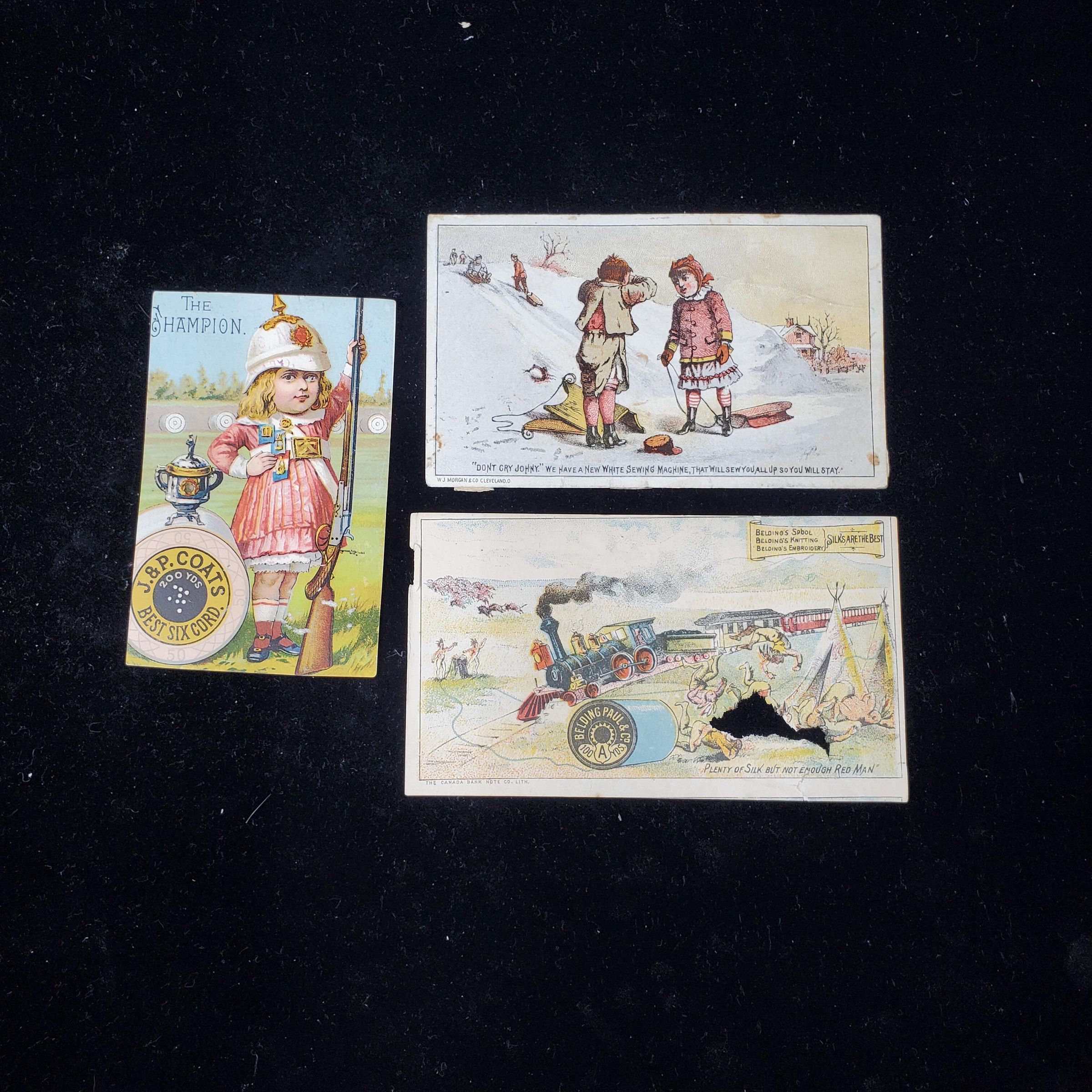 3 advertising trade cards - 1) J&PCoats Best Six Cord Thread -picture of young child with huge gun & trophy on spool of thread.Excellent condition. 2)Beldings -picture of Indians, train, spool of silk Hole in center - poor condition. 3)Picture of 2 children with sled on snowy hill - -advertising byW.J.Morgan & Co. Cleveland.