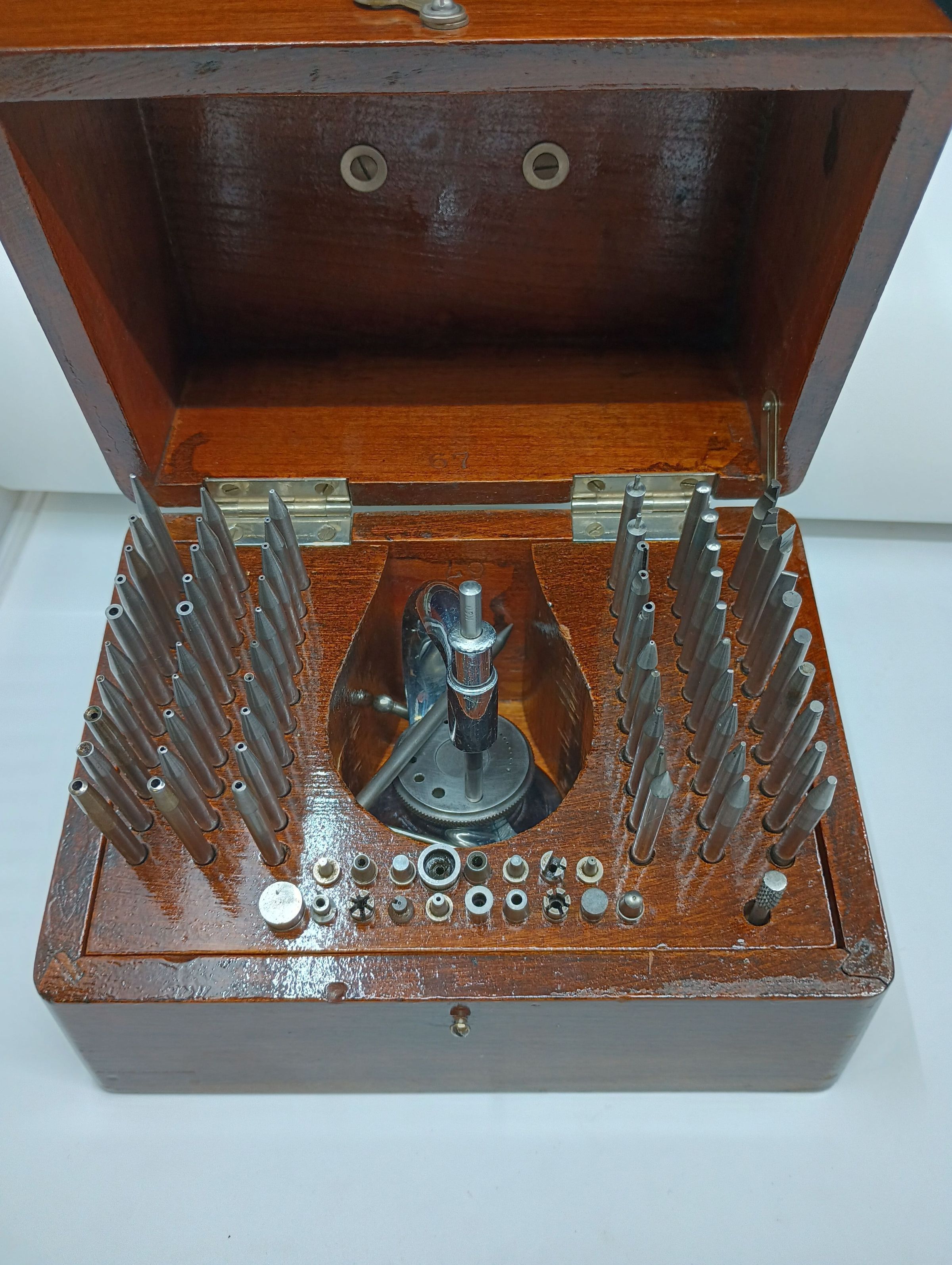Watchmaker staking set in custom wooden box manufactured by Kendrick and Davis.