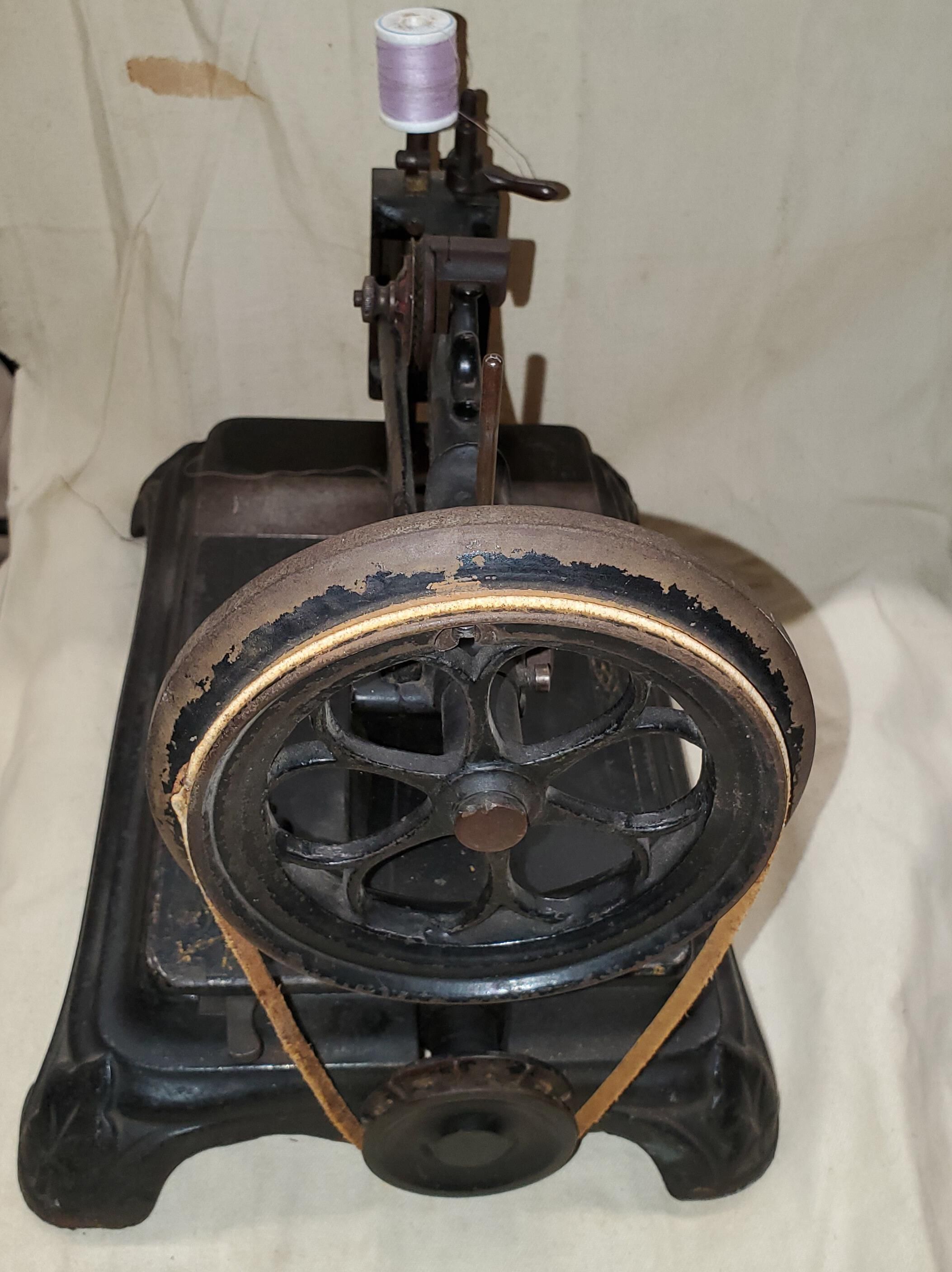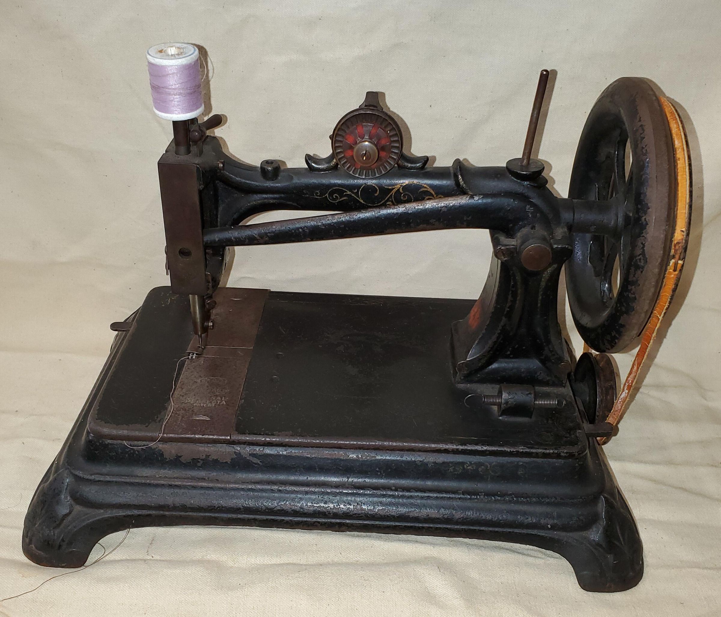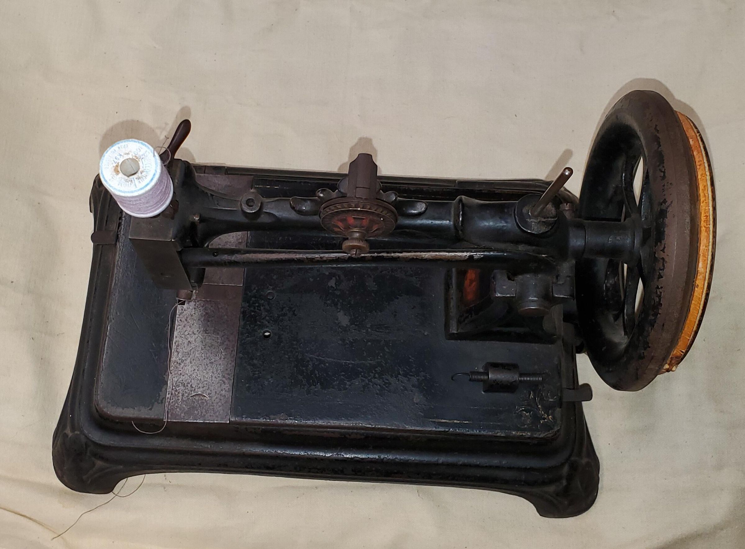 Portable, hand belt driven sewing machine, Serial #3303. Sold by Weaver & Son, bed and mattress makers, sewing machine agents, Bath, U.K.Context