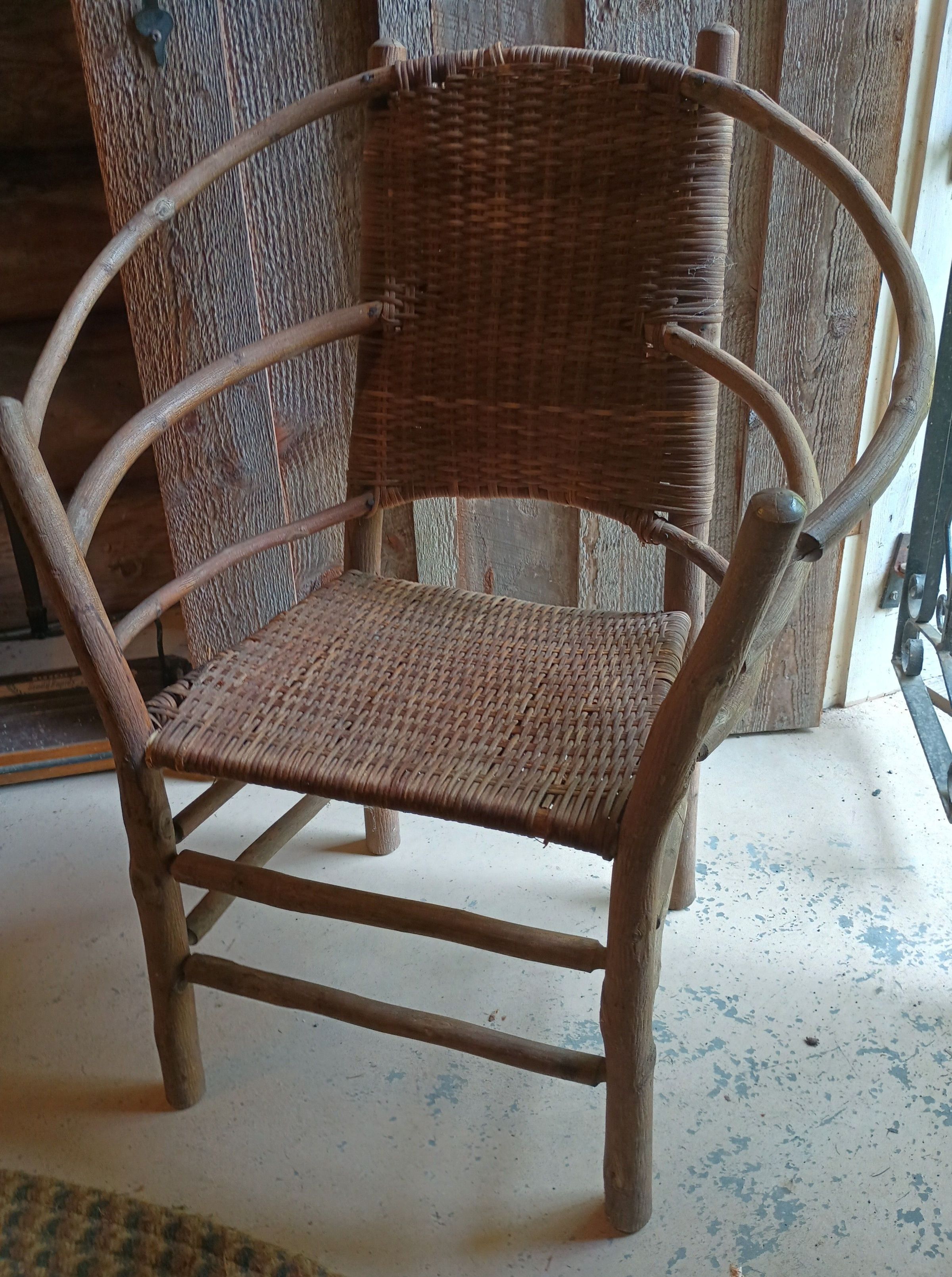 Hand made wicker arm chair with woven seat and back.