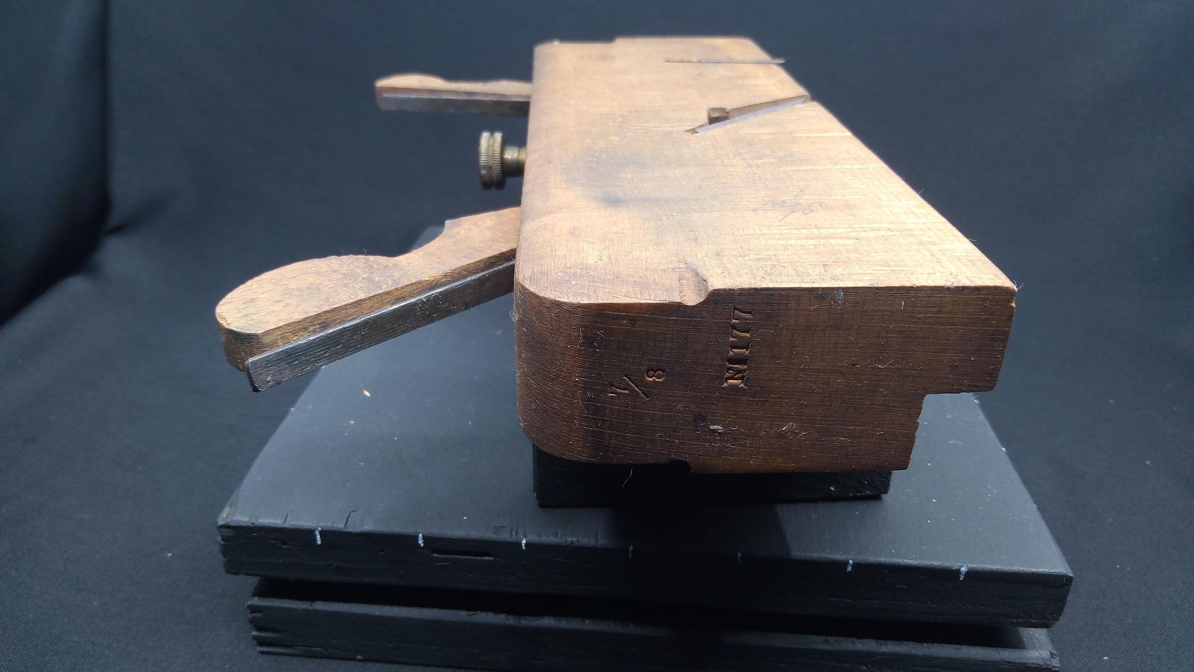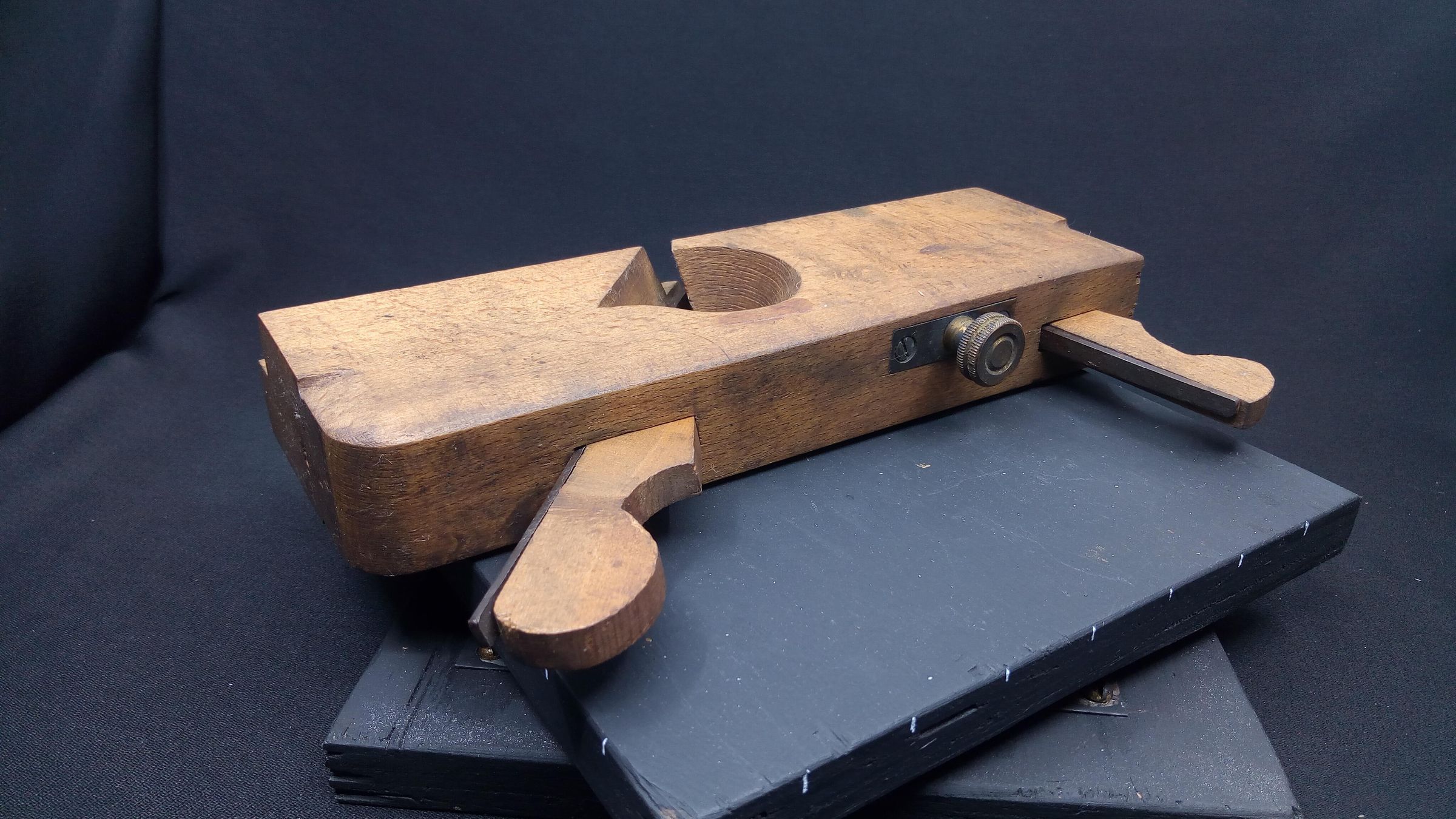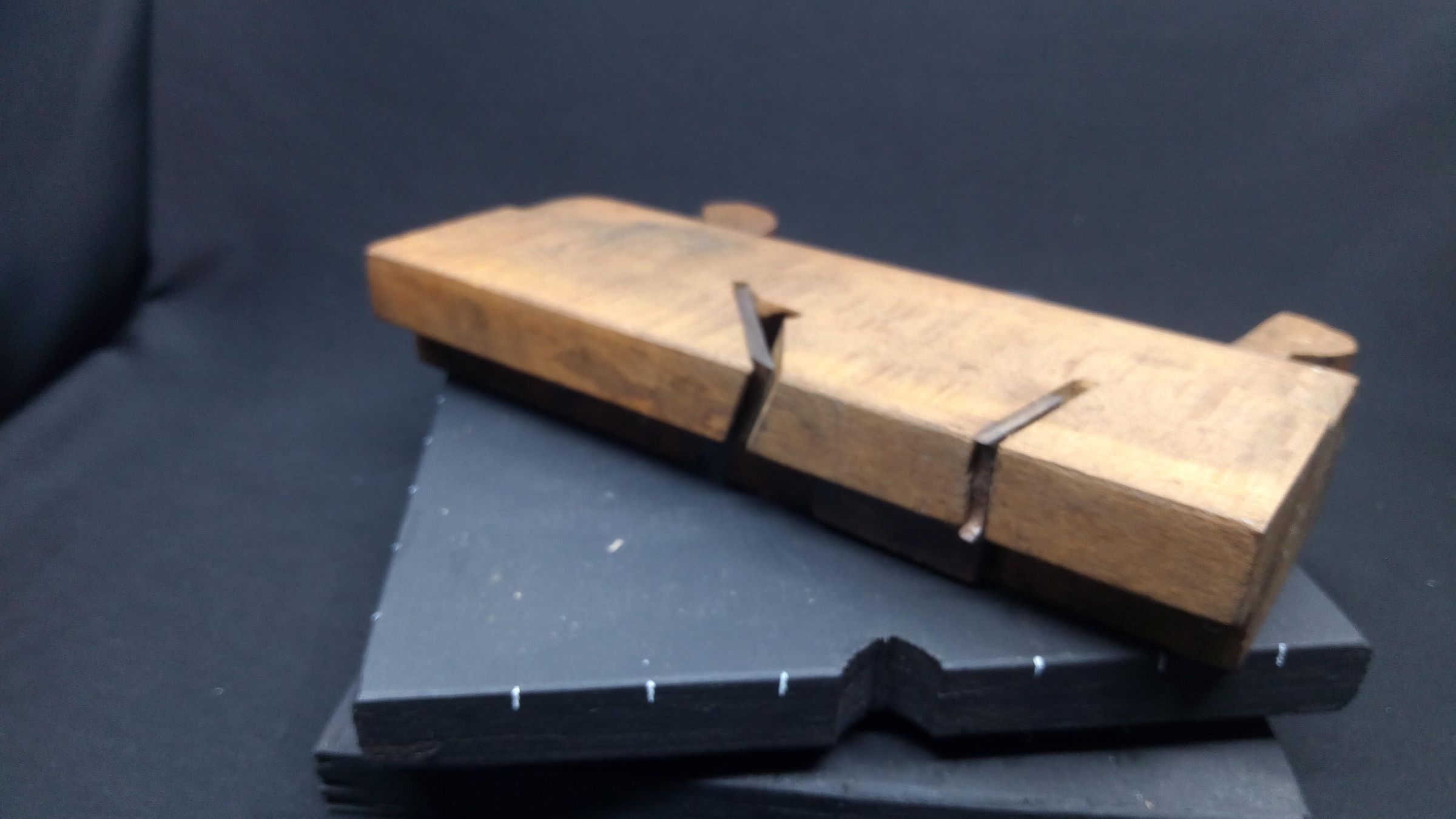 A commercially made wooden housing plane with a skewed main blade, a front slitting cutter, and a screw adjustable depth stop.Use