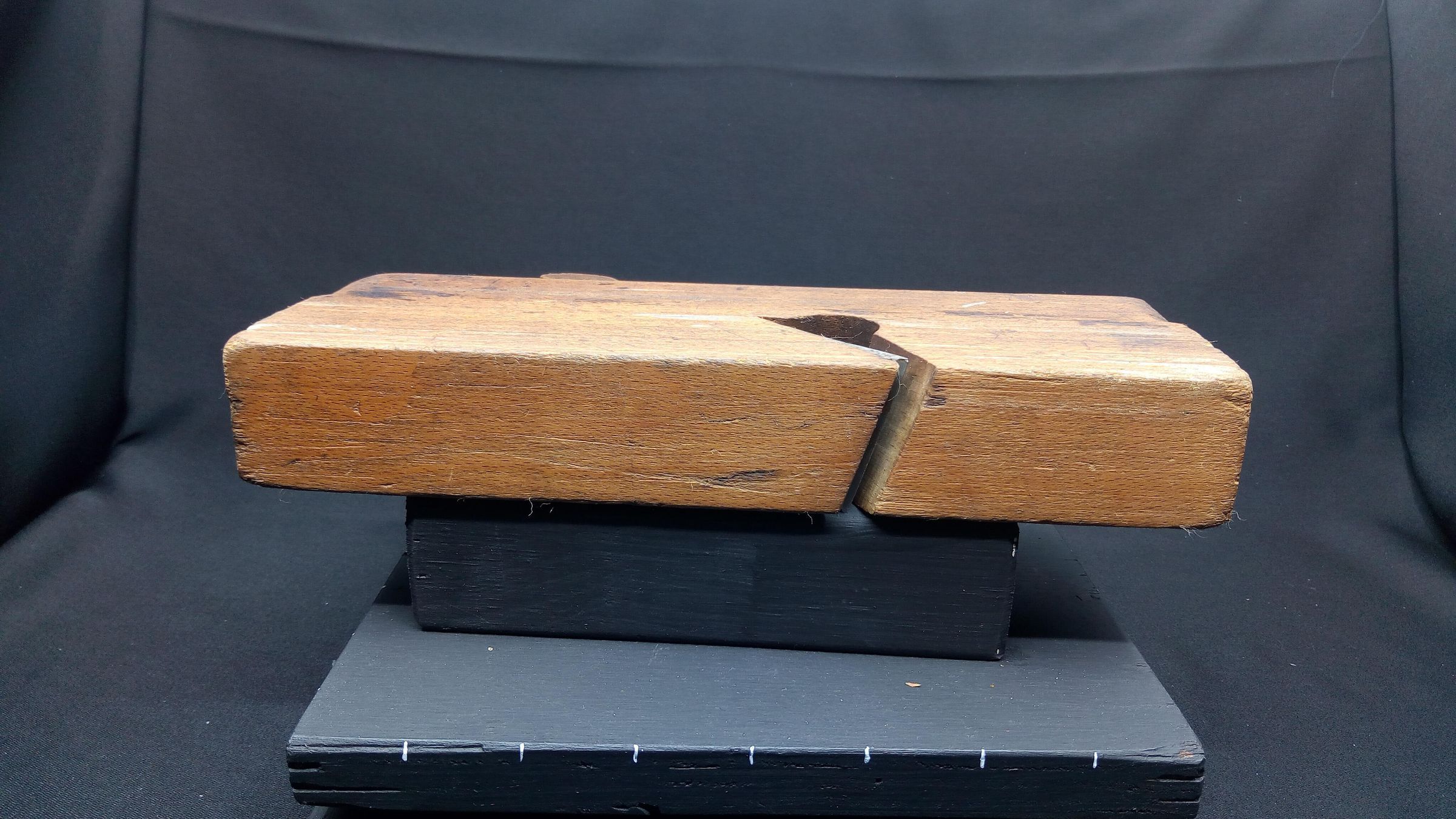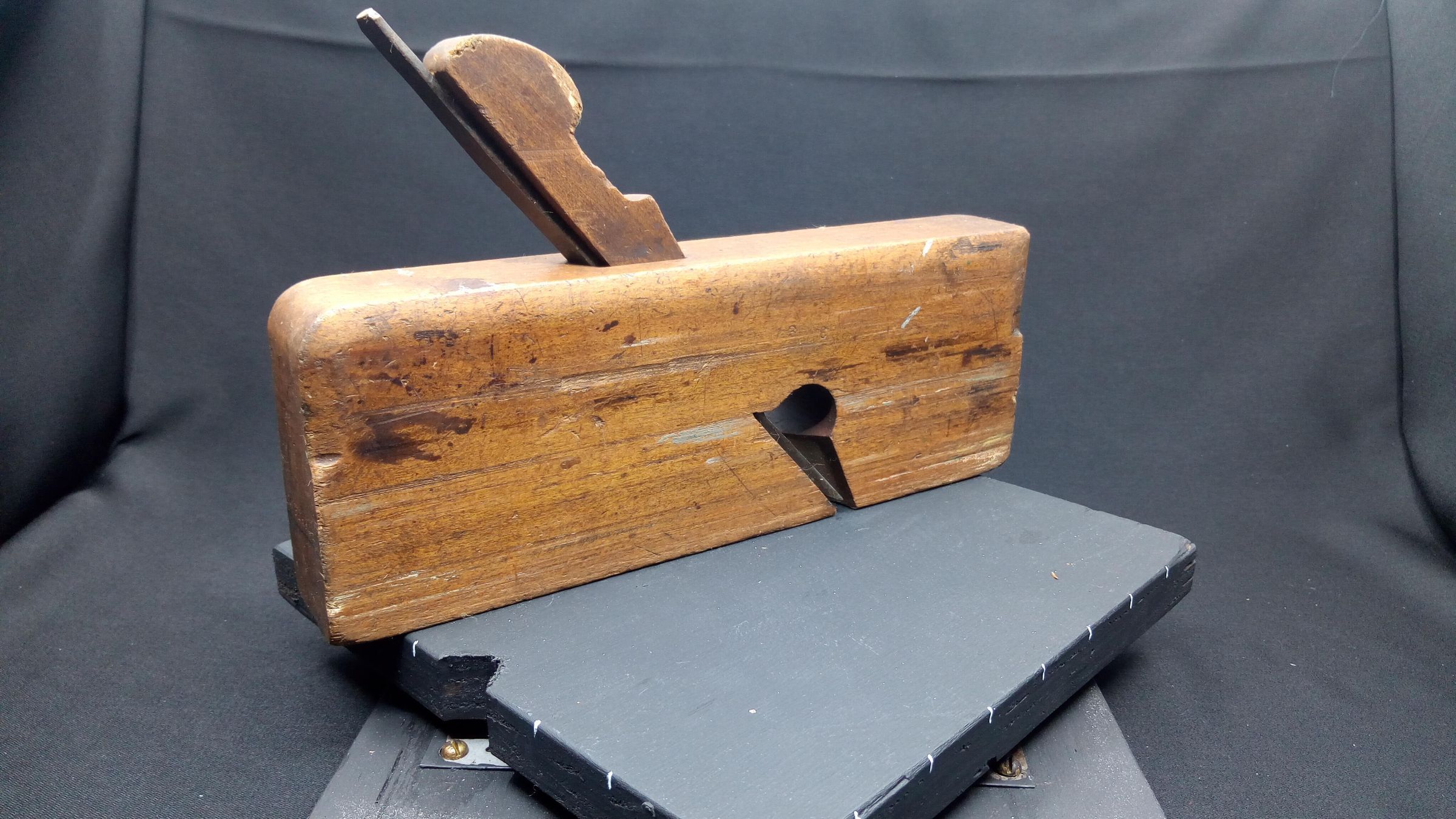 A straight forward wooden rabbet plane with a skewed blade. Signs of extensive use.Use