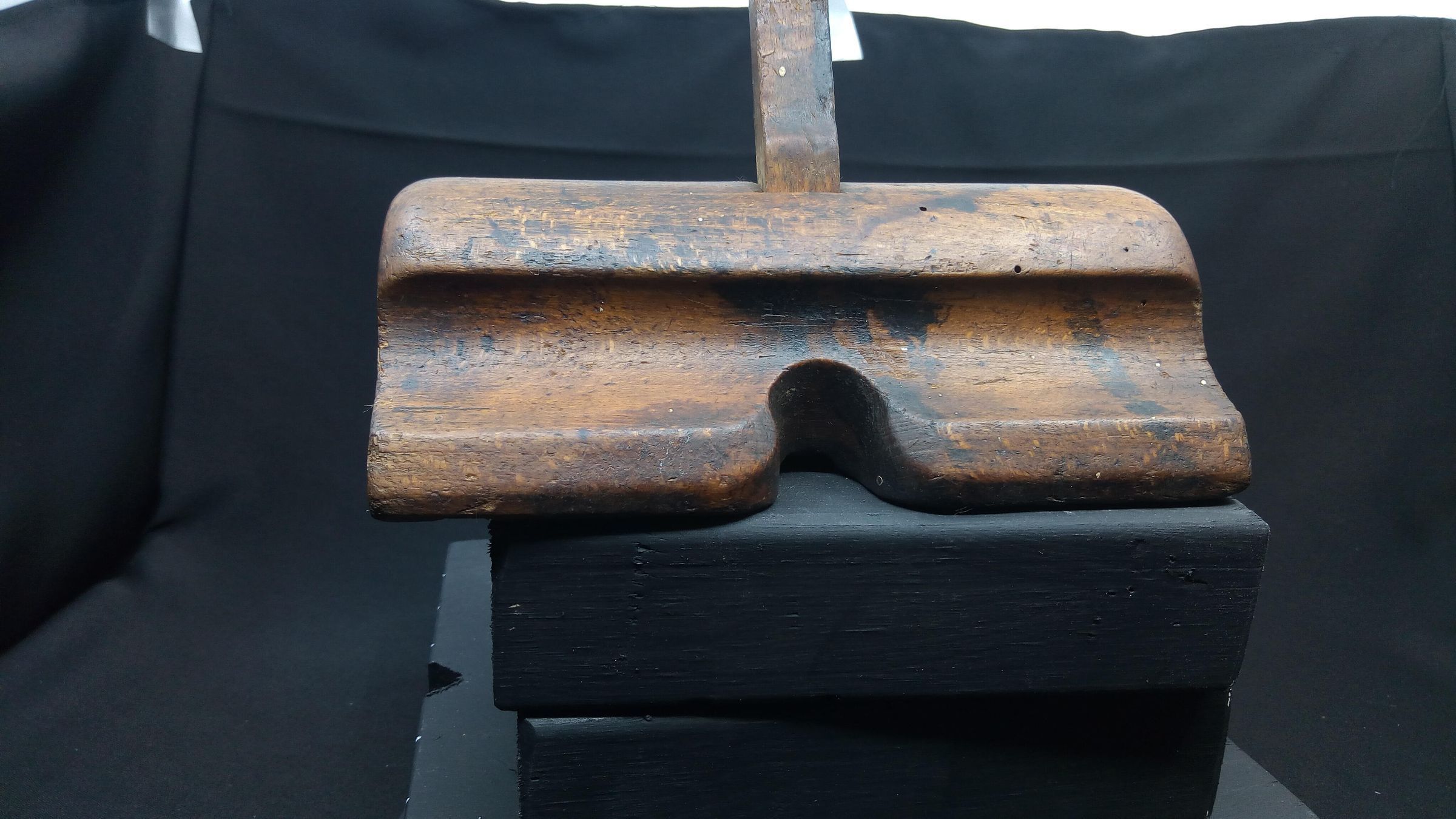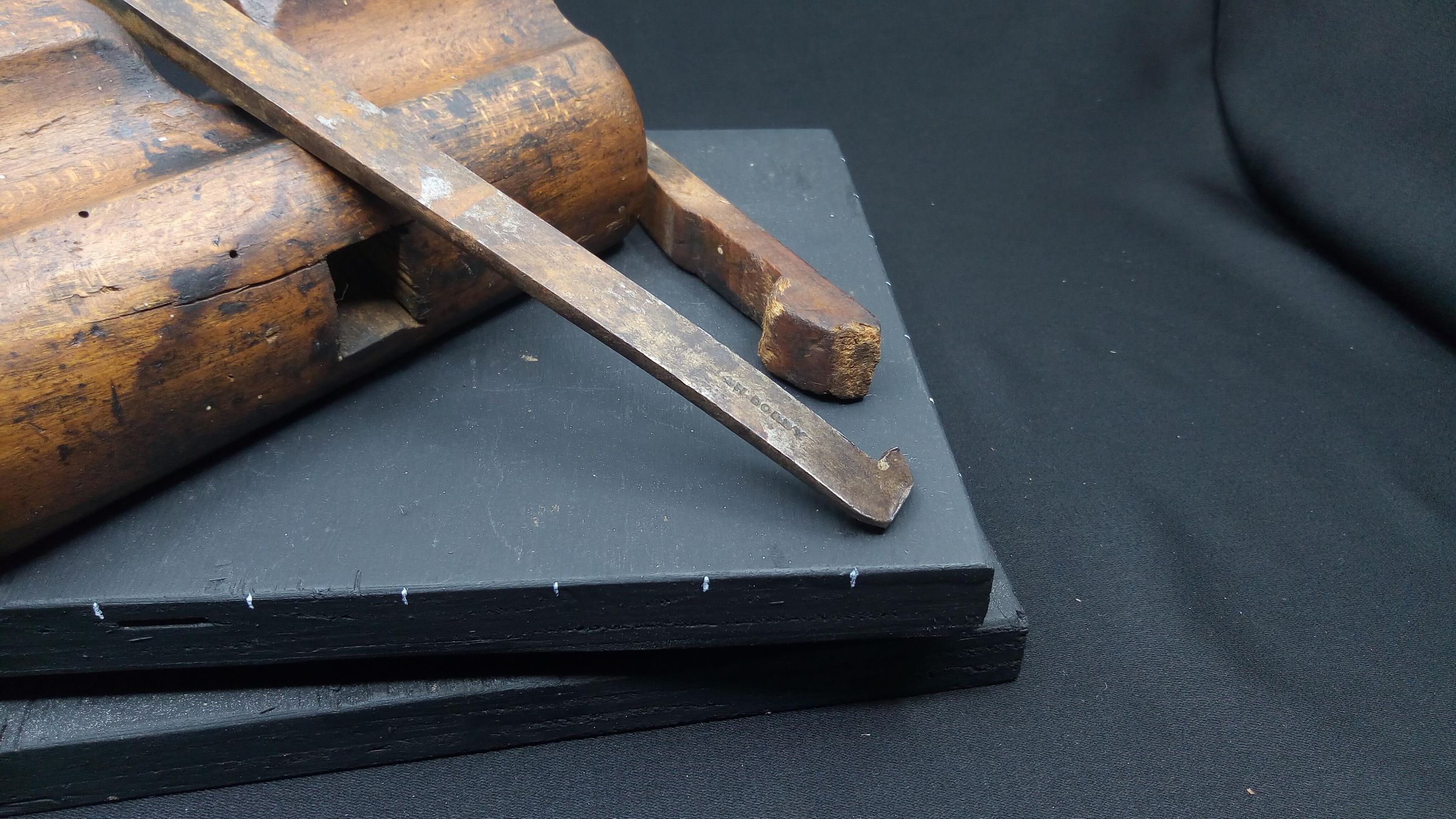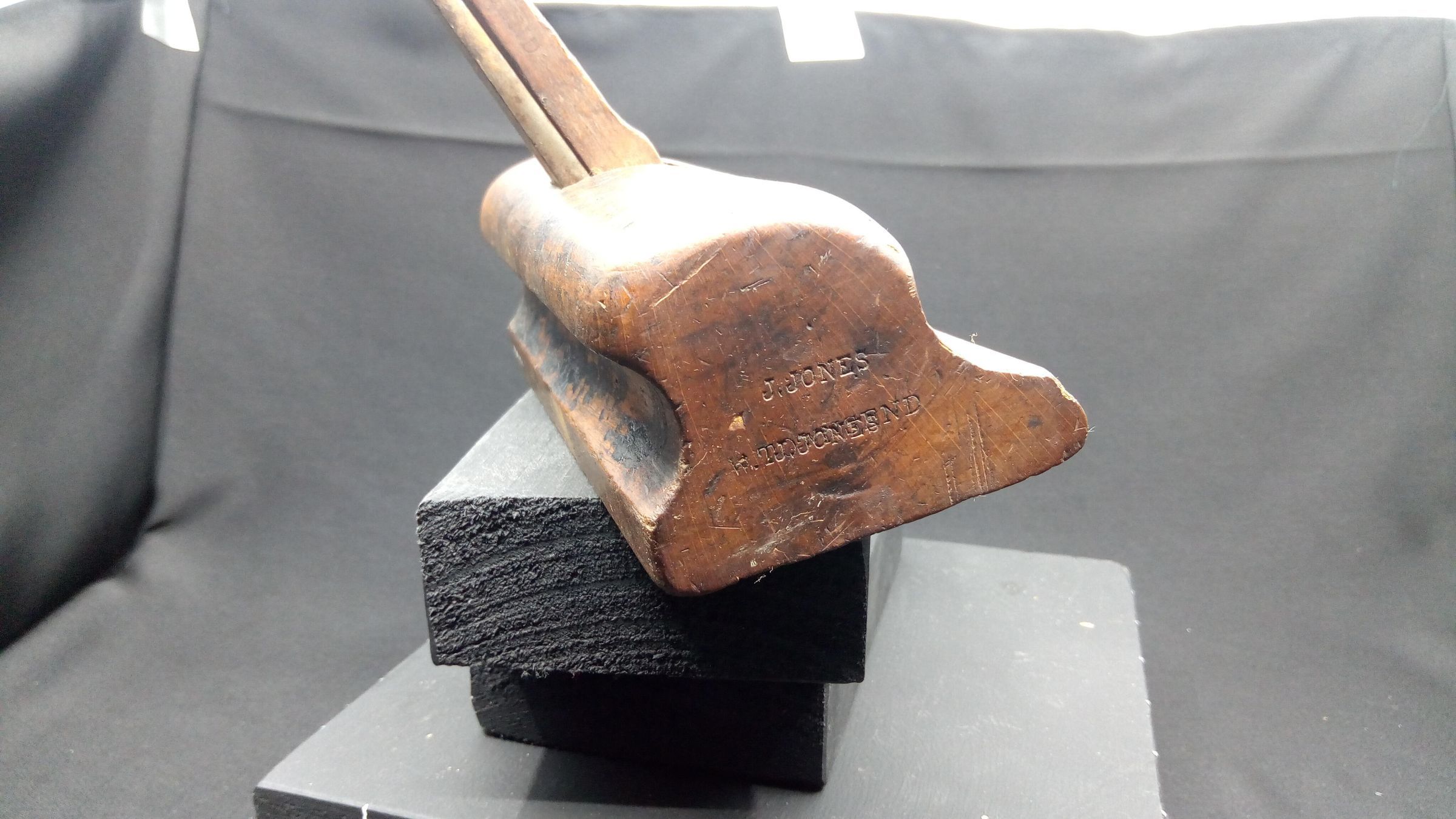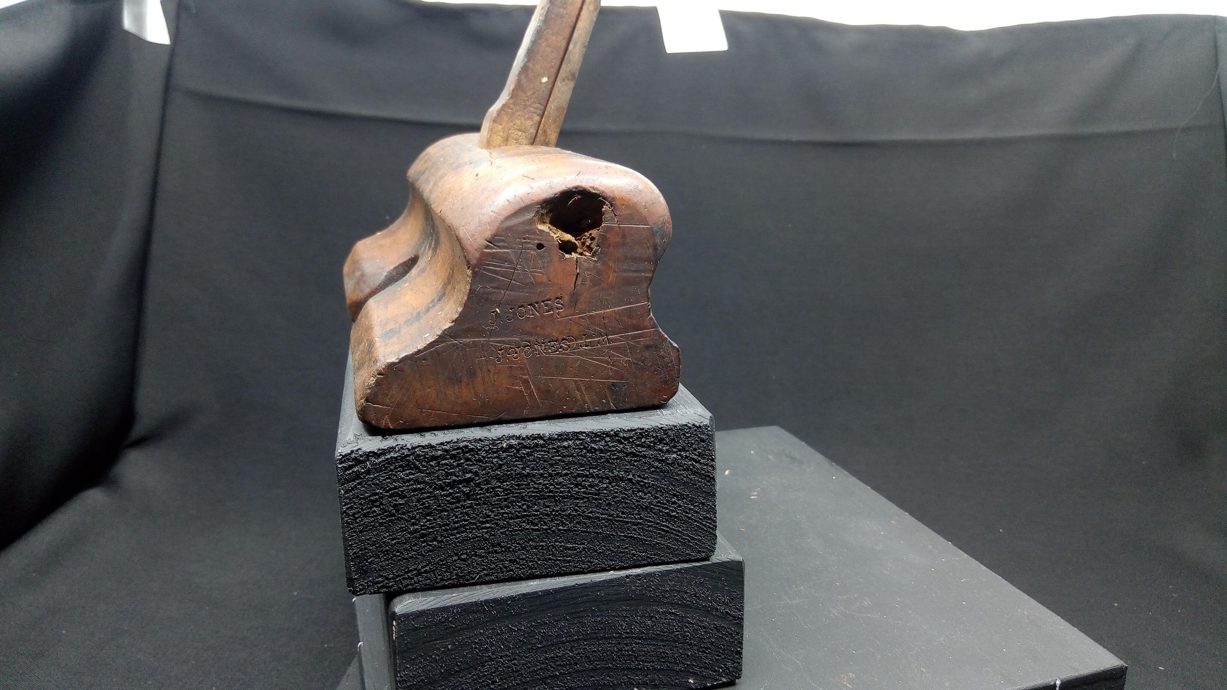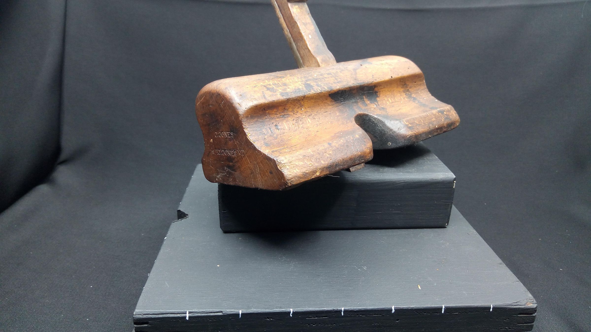 It isn't clear whether this plane was manufactured or home made. The marks on it are owners' stamps rather than company stamps. The iron is from a set that would have originally been supplied with an adjustable plough plane. The groove in the back was the location point for the plough plane's skate. The iron is quite thick, very suitable for this application, so the plane might have been built around this iron by an owner, or it might be a replacement. It has clearly seen much use, and has been stamped by two or more separate owners. Despite the woodworm holes, the age, the wear, the dirt, and the hole in the end, it feels good in the hand.