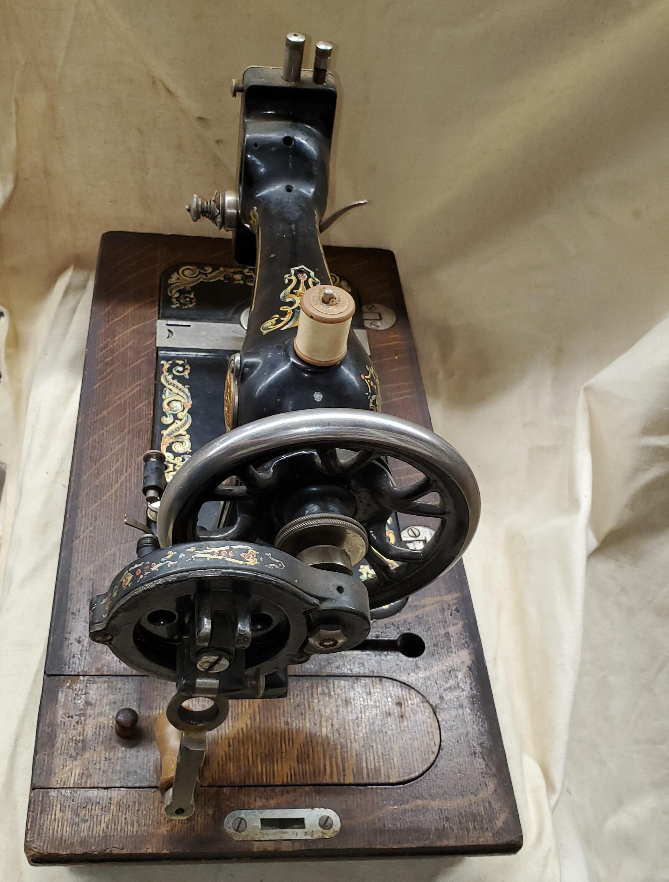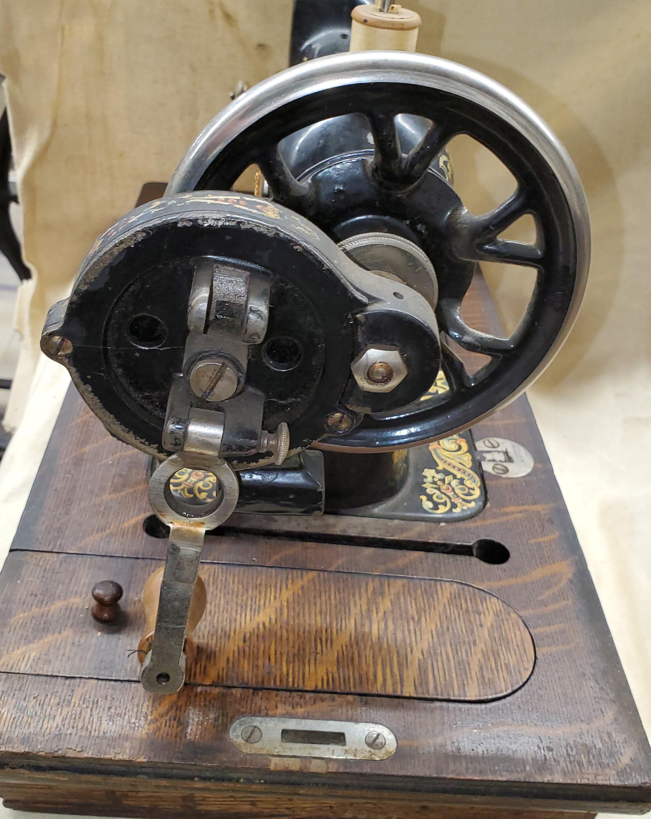High quality Japanese clone of the popular Singer sewing machine. Portable, hand crank power. Sold by Marshall Wells, a hardware franchise based in Winnipeg.
