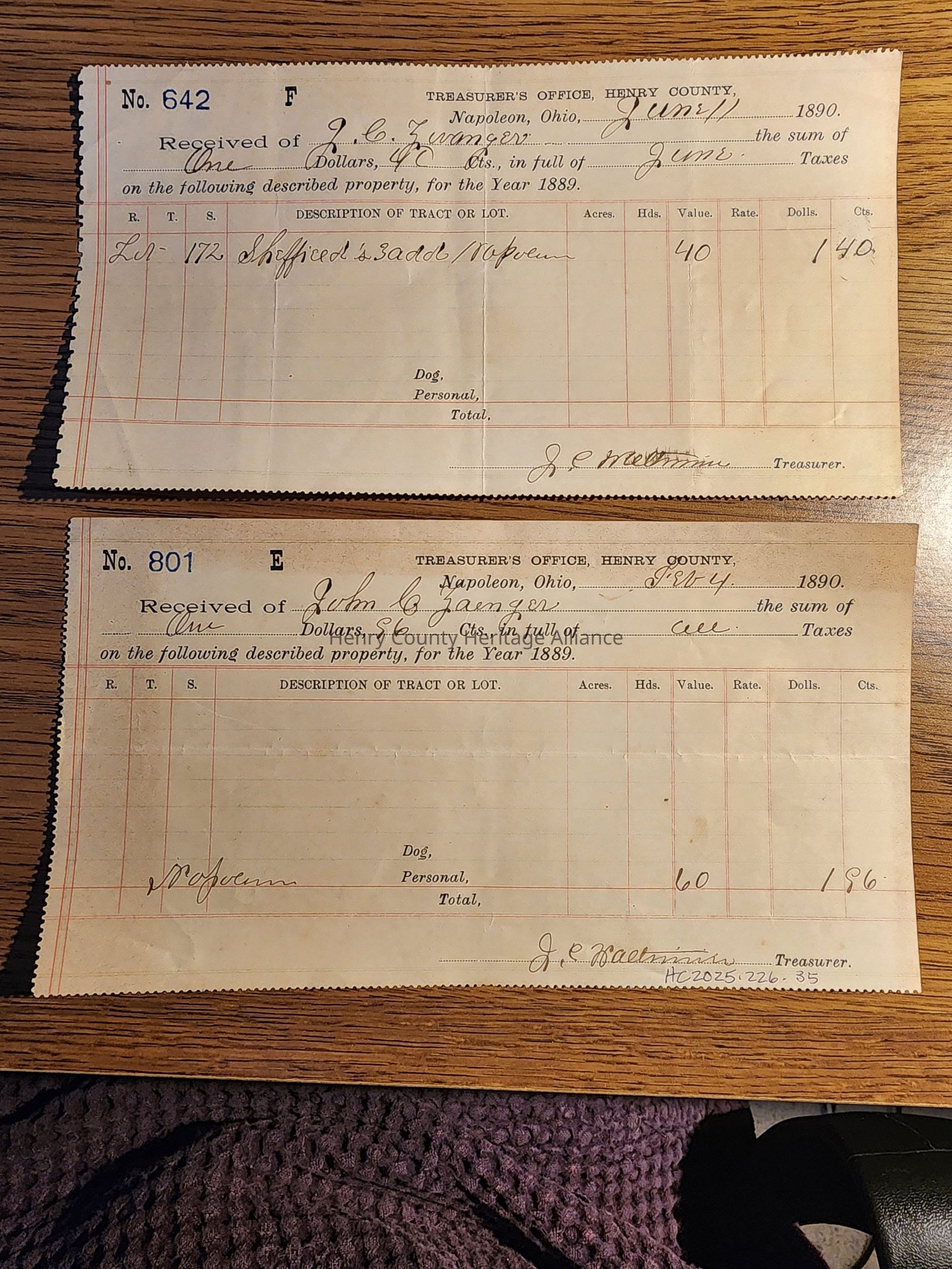 1889 (2) Henry County Treasurer Tax Stubs