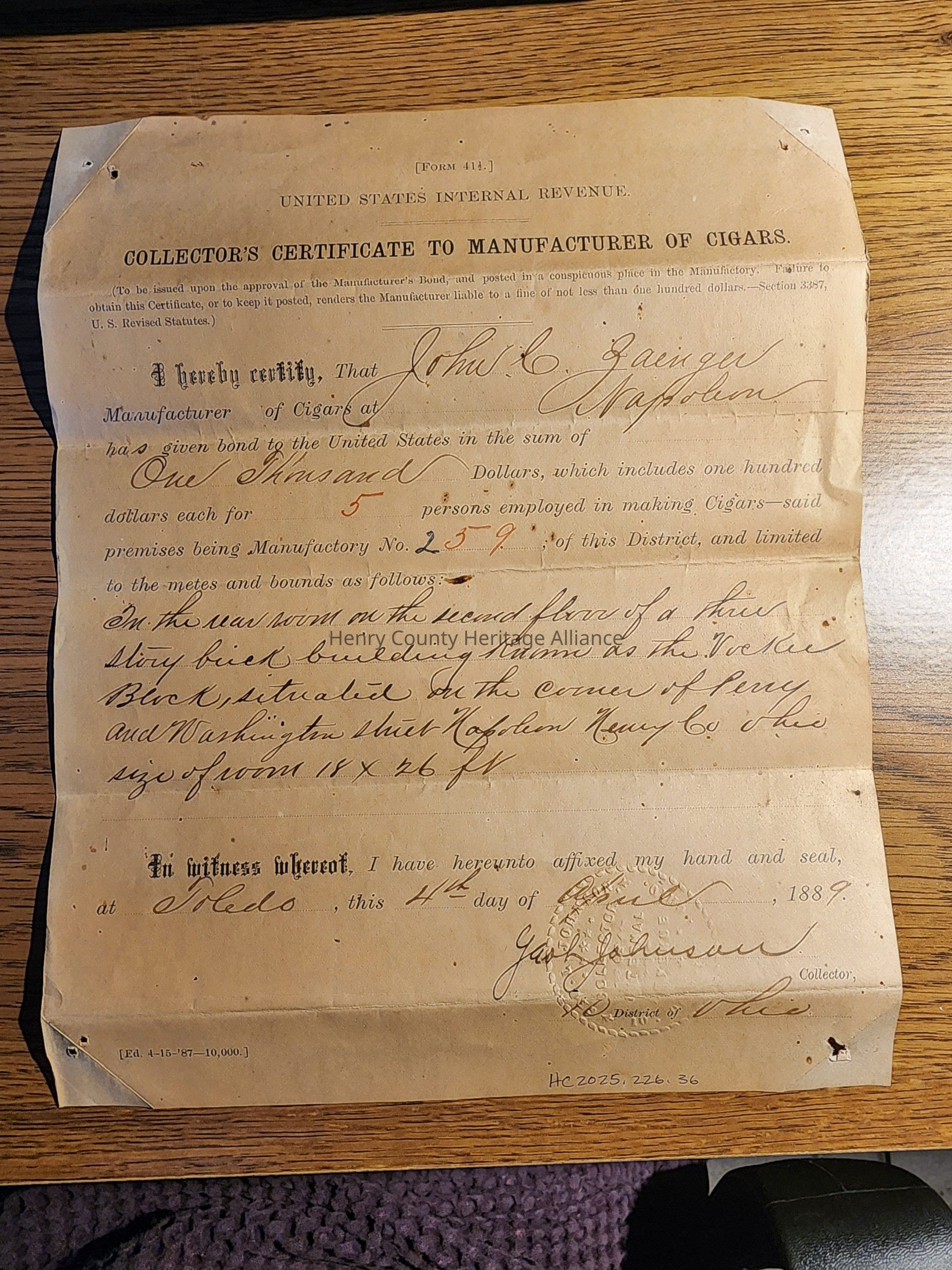 1890 Collectors Certificate of Registry, Cigar Manufacturing