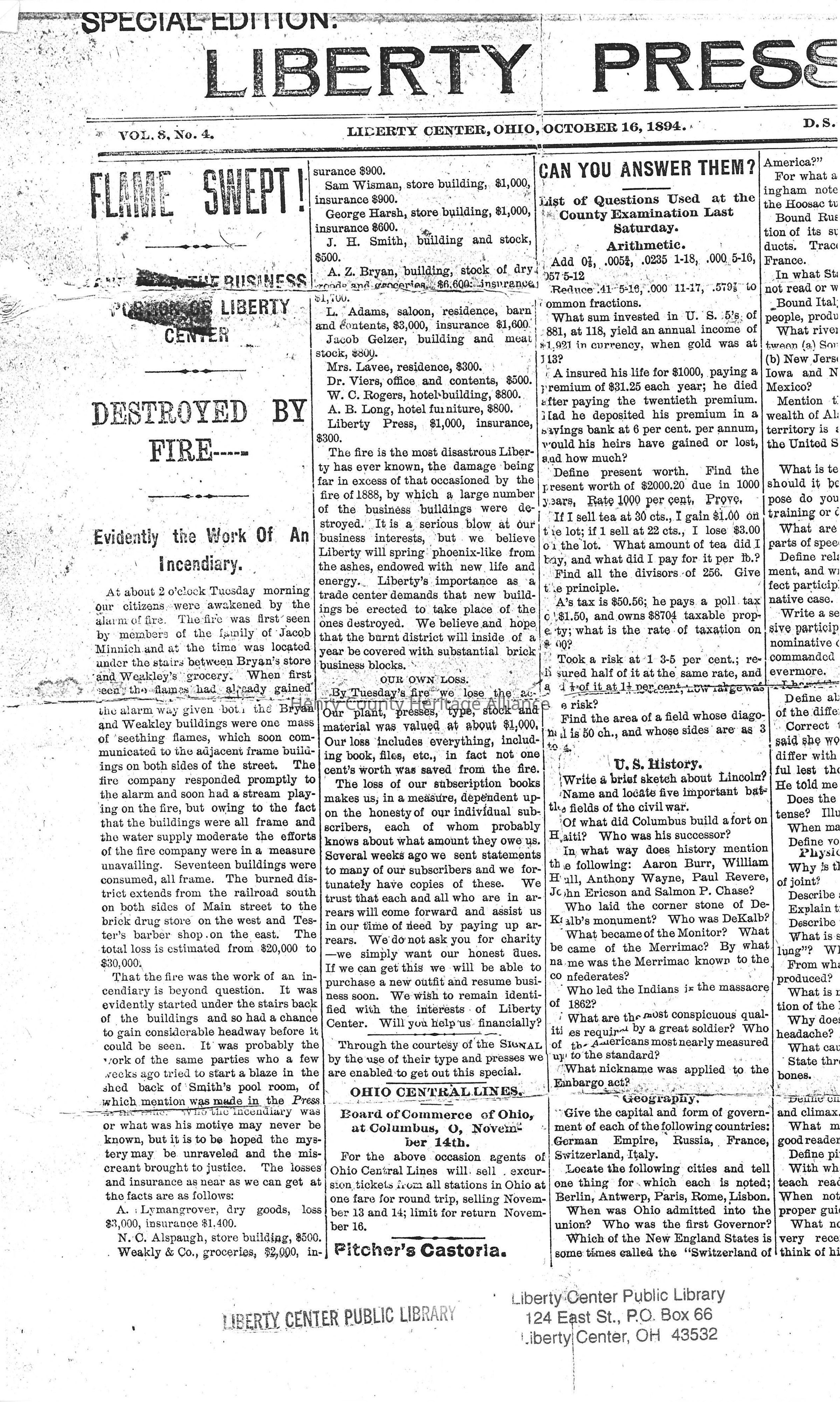 1894 Liberty Press News Clipping of Liberty Center Fire