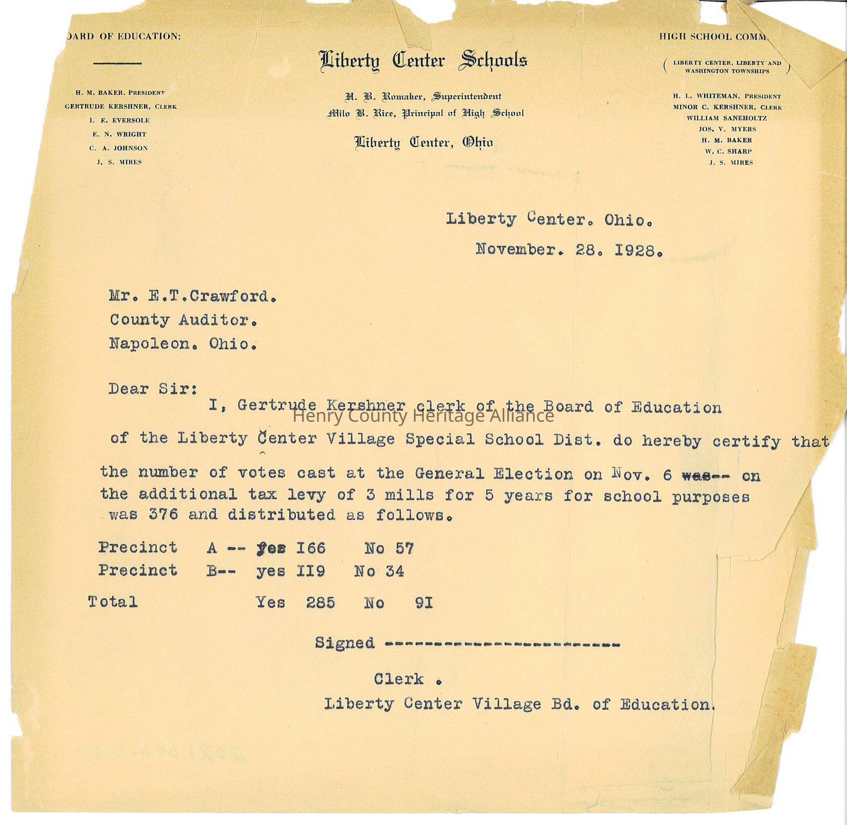 Letter certifying the passing of a 3 mill levy on Nov. 28, 1928 by Gertrude Kershner, clerk of the Board of Education of the Liberty Center School District.Collection