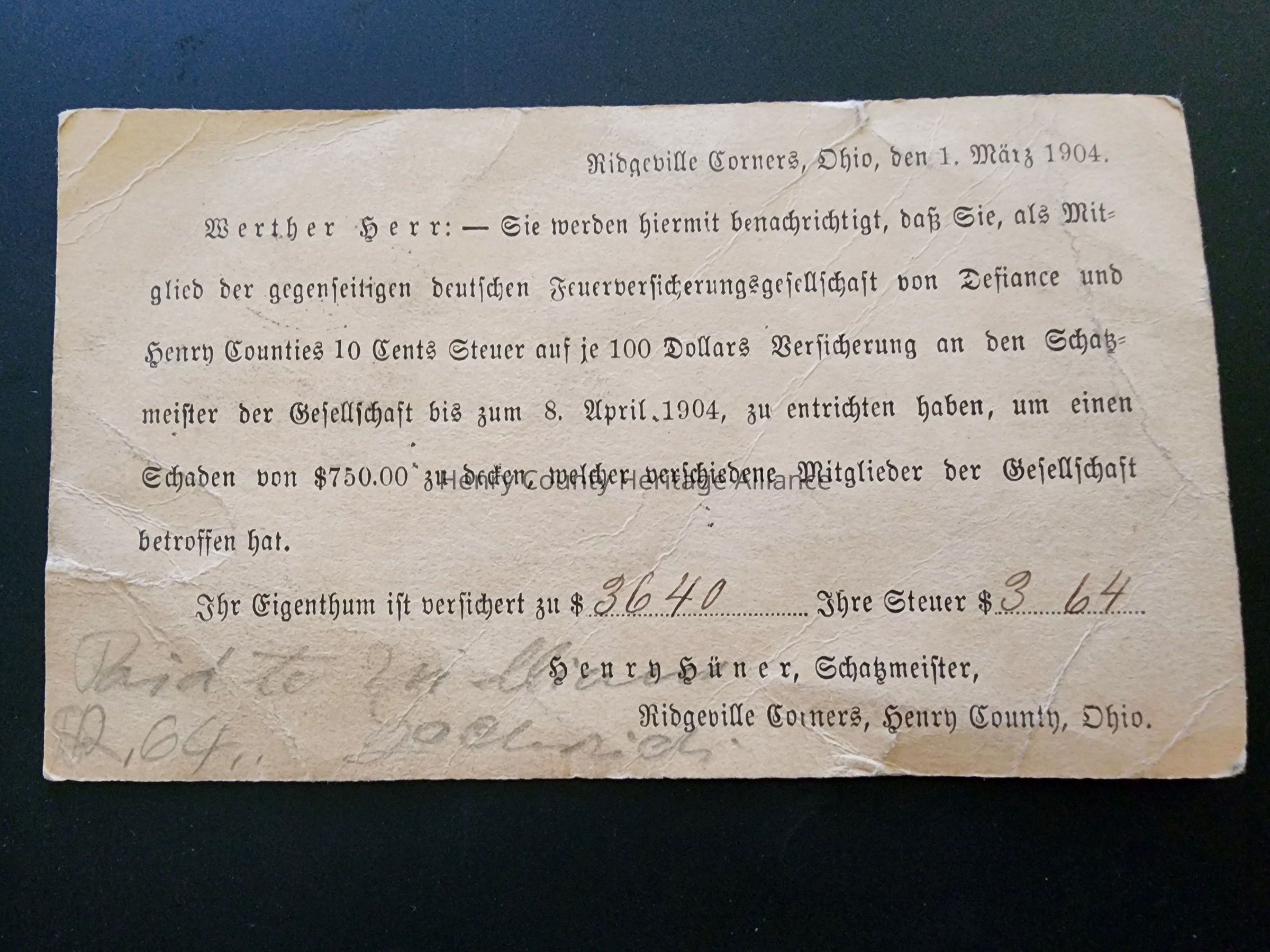 1904 W.F.Wolf Ridgeville Corners, Ohio Postcard from Insurance Company Re: Claim, German