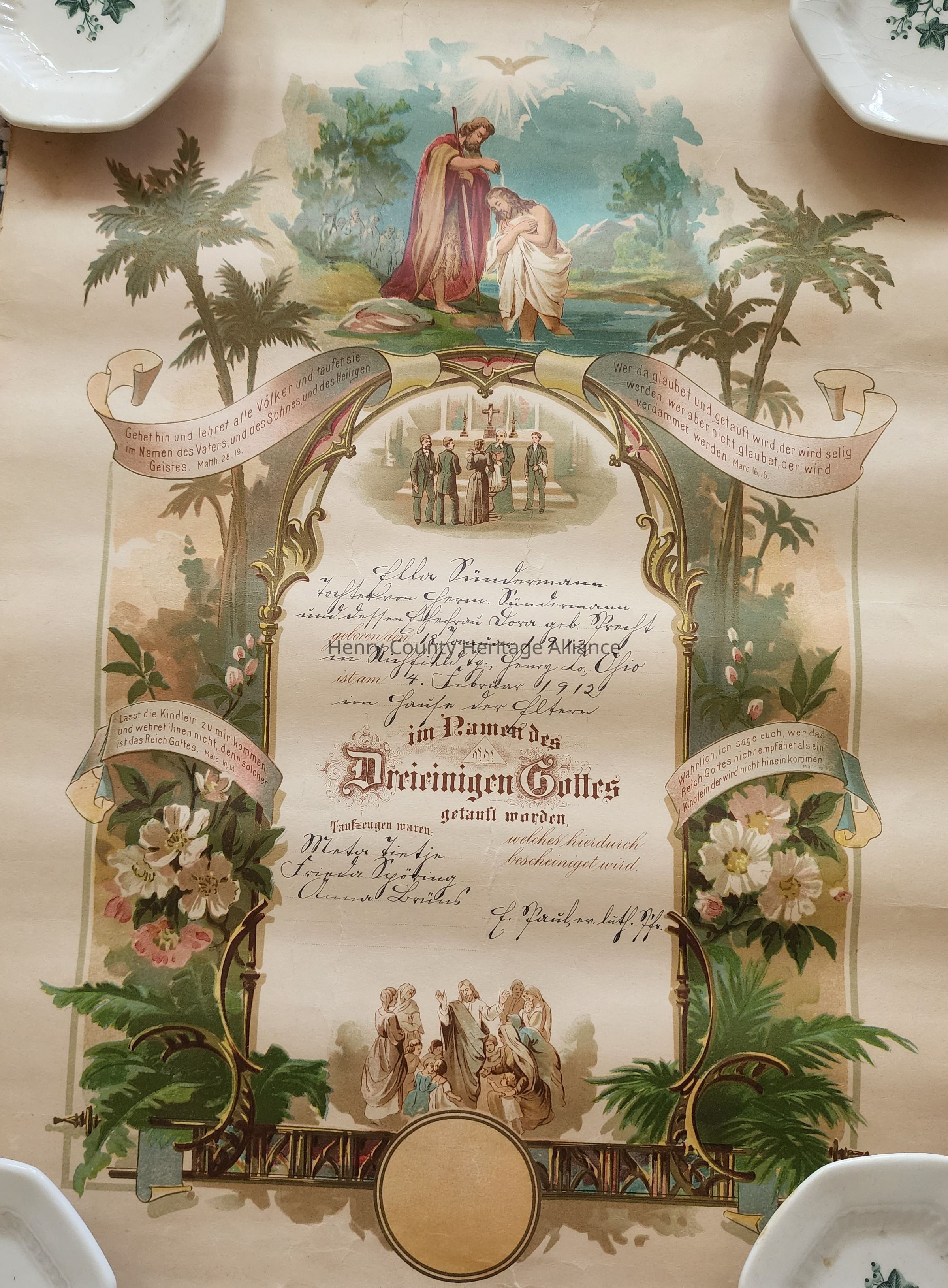 1912 German Certificate, Baptism, Richfield Twp. Henry County, Ohio