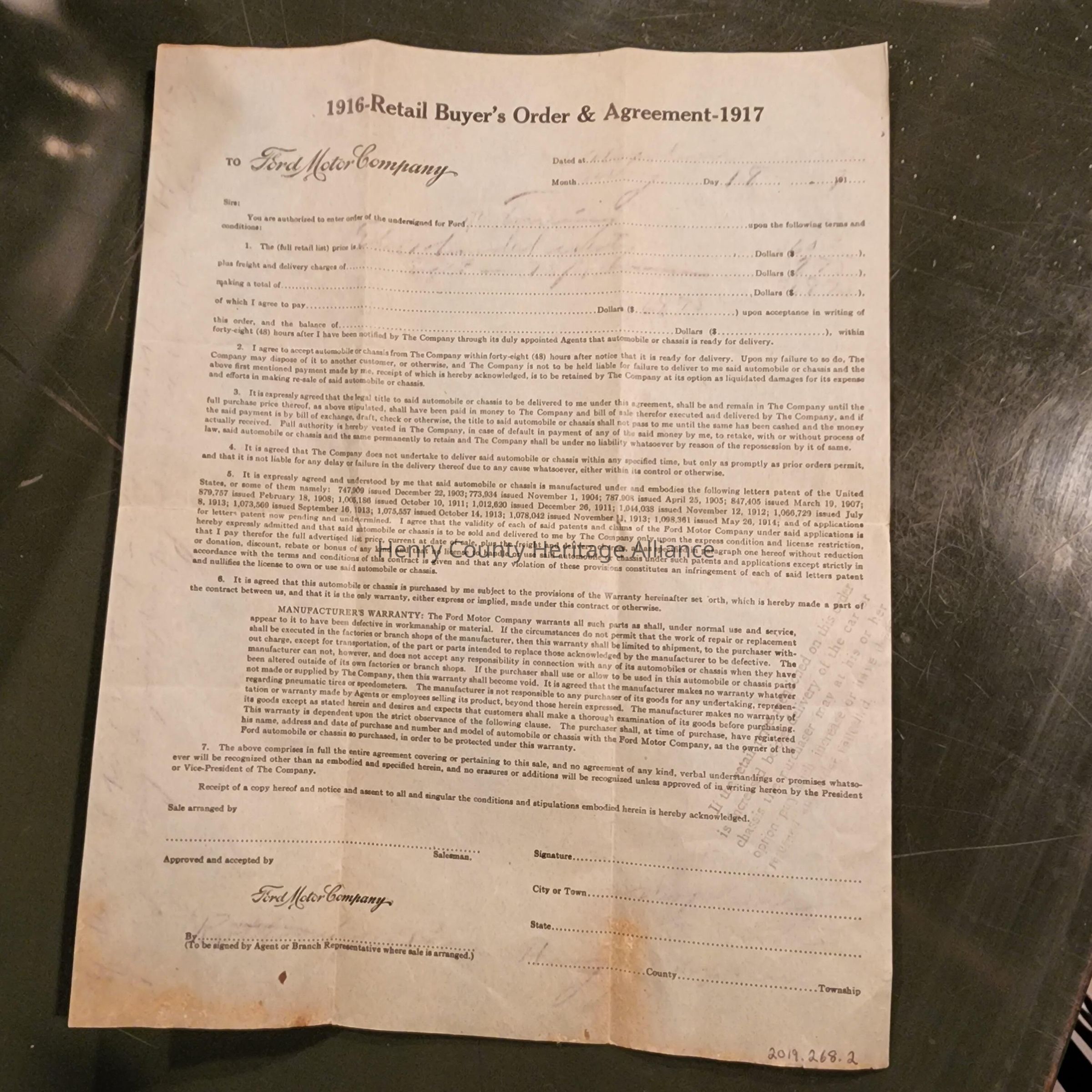 1916 Retail Buyer's Order, Ford Motor Co