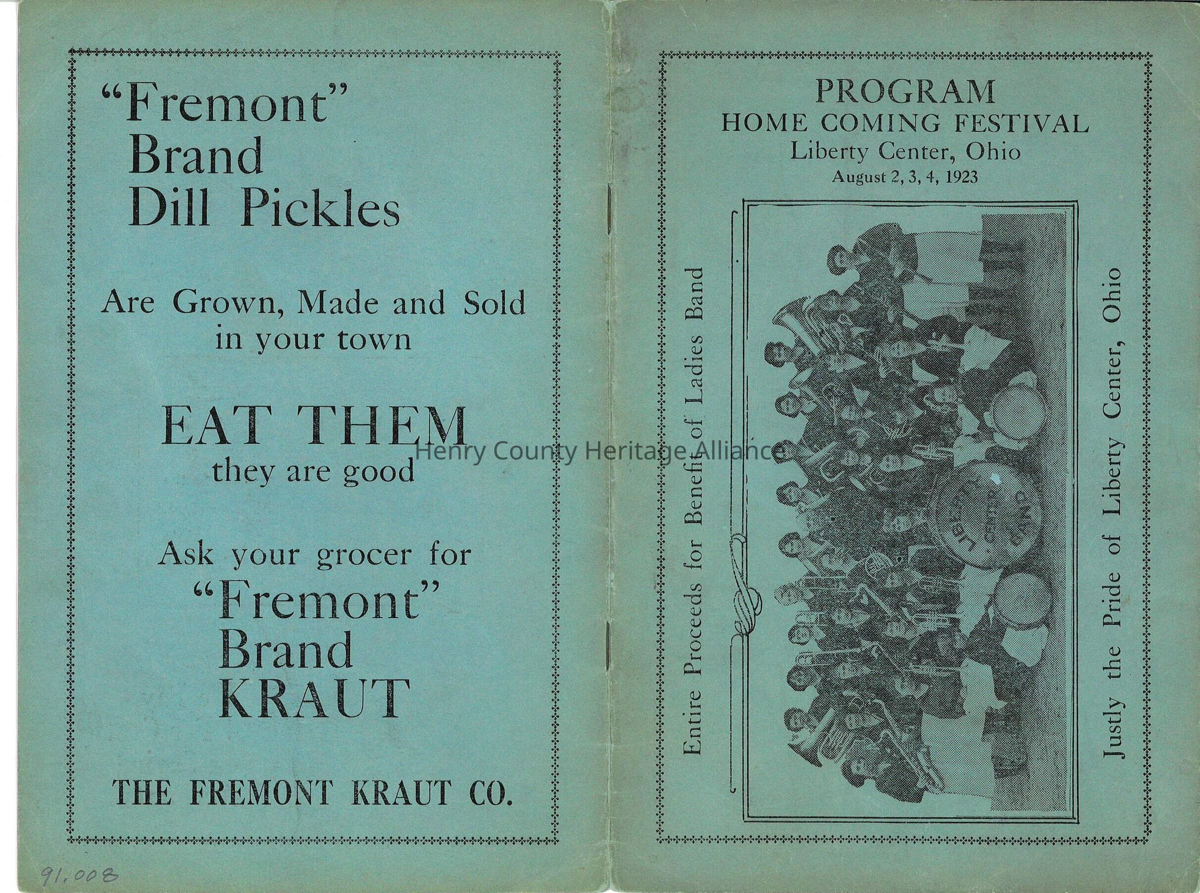The image is of a vintage flyer on a blue background for "Fremont" Brand Dill Pickles, which are promoted as being grown, made, and sold locally with the encouragement to "EAT THEM" because they are good. It suggests asking the grocer for "Fremont" Brand Kraut from The Fremont Kraut Co. The right side of the image features a program for a Homecoming Festival held in Liberty Center, Ohio, on August 2, 3, and 4, 1923. It includes a photograph of a women's band, with text indicating that entire proceeds will benefit the Ladies Band, noting it as "Justly the Pride of Liberty Center, Ohio."