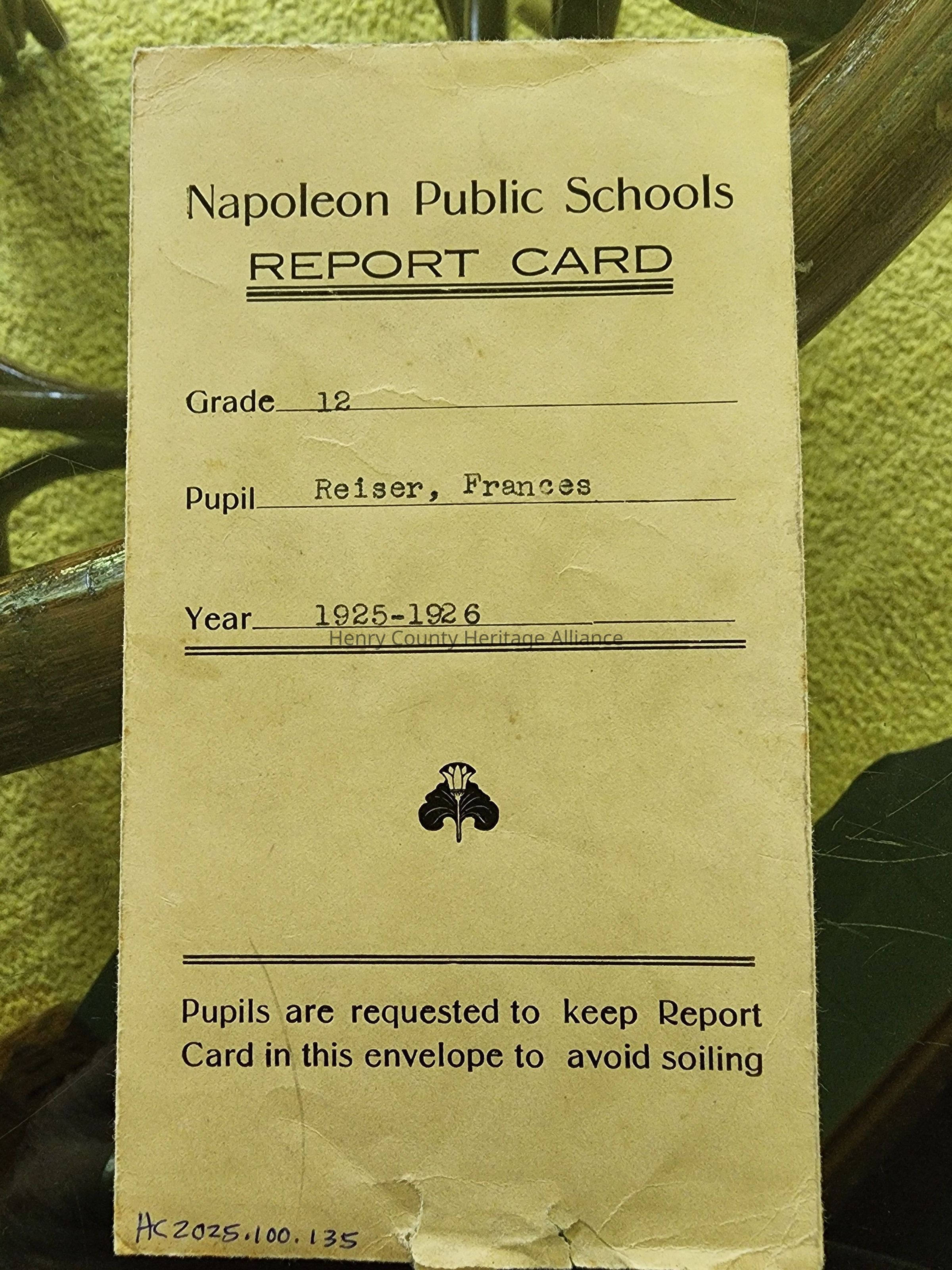 1925-26 NHS Frances Reiser Grade Card