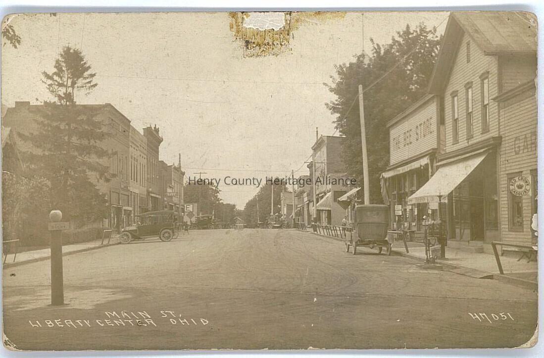 The sepia-toned photograph captures a nostalgic view of Main Street in Liberty Center, Ohio, during an early twentieth-century period. The scene is flanked by rows of wooden and brick buildings, demonstrating the architectural style of that era. On the right, a general store with a prominent awning displays various goods, while adjacent garage, hinted at by faded "Red Crown Gasoline" sign. Trees line the street, and a dirt road extends into the distance, occupied by vintage automobiles and horse-drawn carriages, reflecting the transition in transportation methods. A significant well pump stands on the left, alongside hitching posts for horses, suggesting a communal spot for watering horses. The image portrays an era before modern developments, evoking a slower-paced lifestyle where community interactions flourished along these streets.