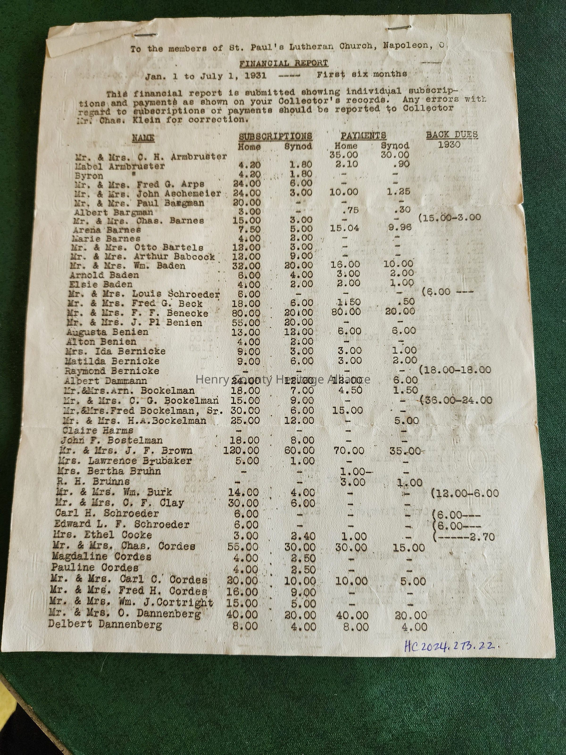 1931 St Paul Lutheran Church, Napoleon Financial Report, 4 Pages, Including Tithes
