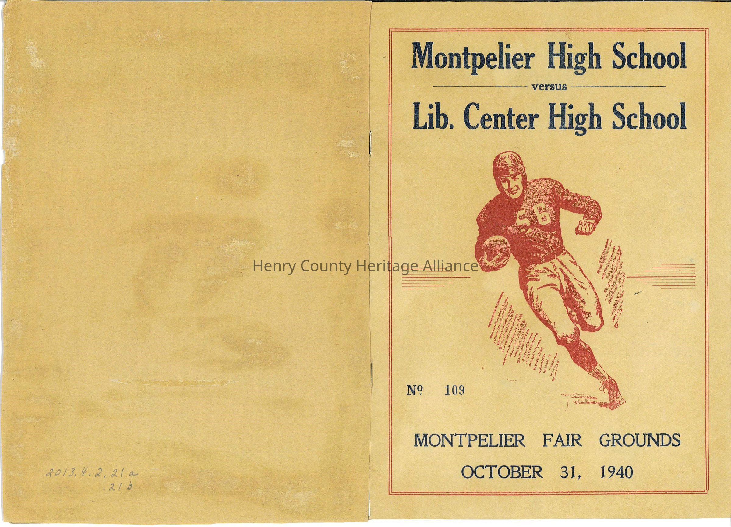 1940 Football Program Montpelier High School vs Liberty Center High School