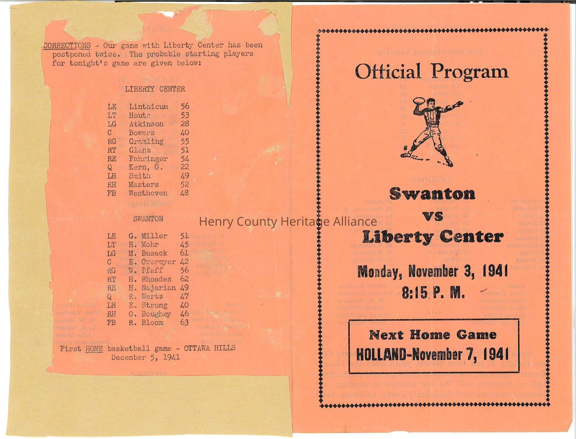 1941 Official Football Program Swanton vs Liberty Center