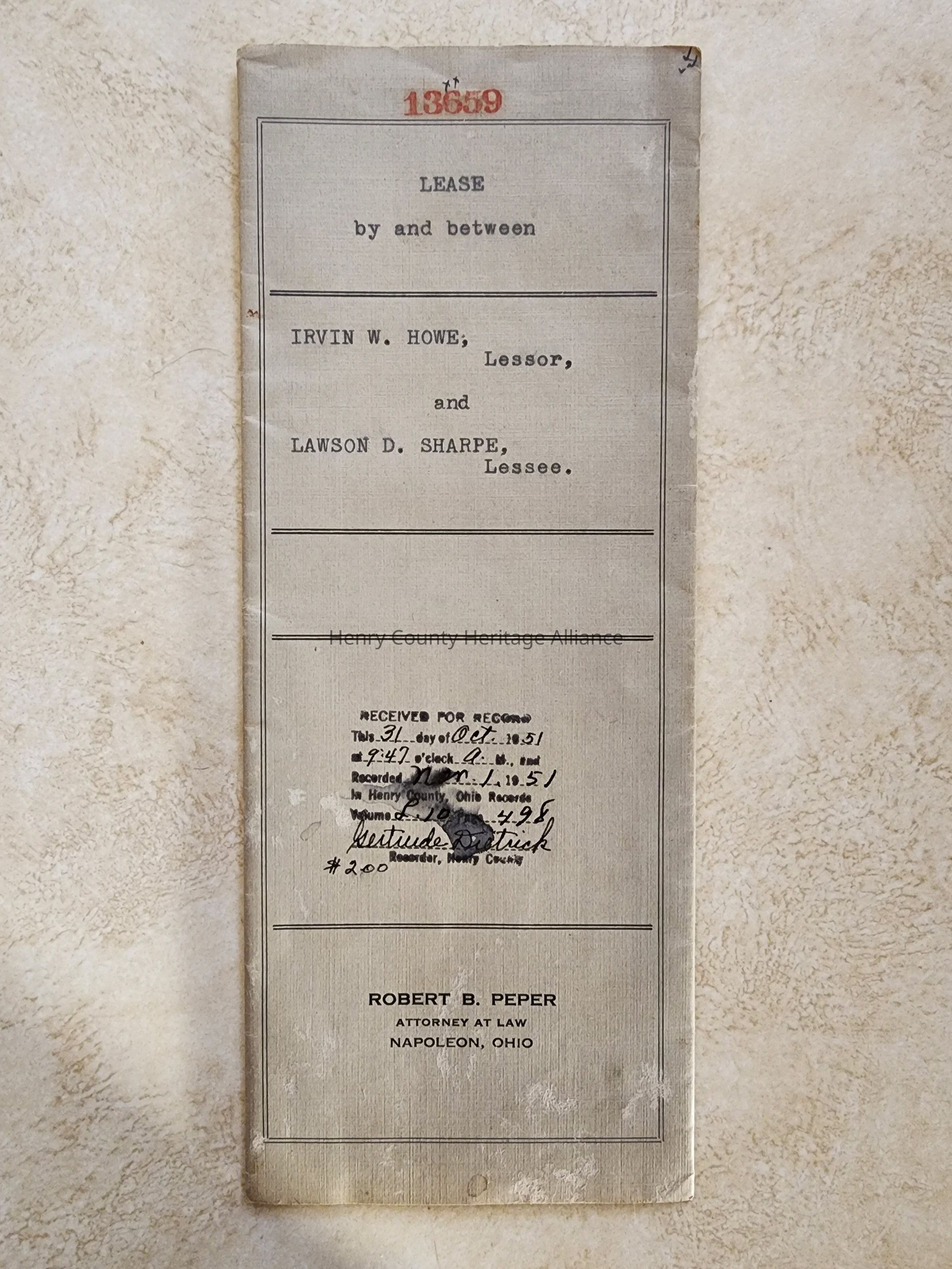 1951 Lease Agreement between Irwin Howe & Lawson Sharpe, Holgate, Ohio