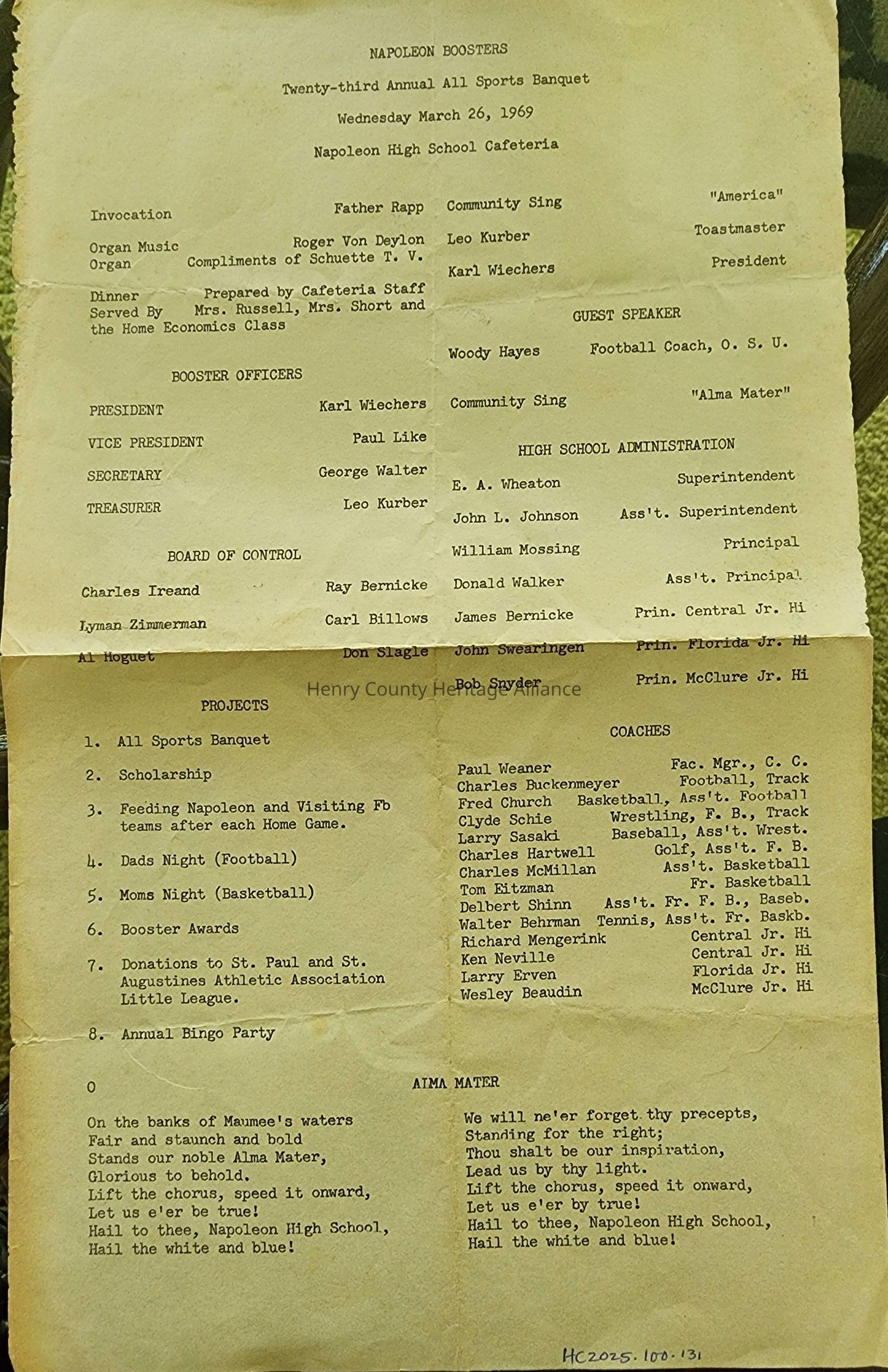 1969 NHS All Sport Banquet, Guest Speaker: Woody Hayes