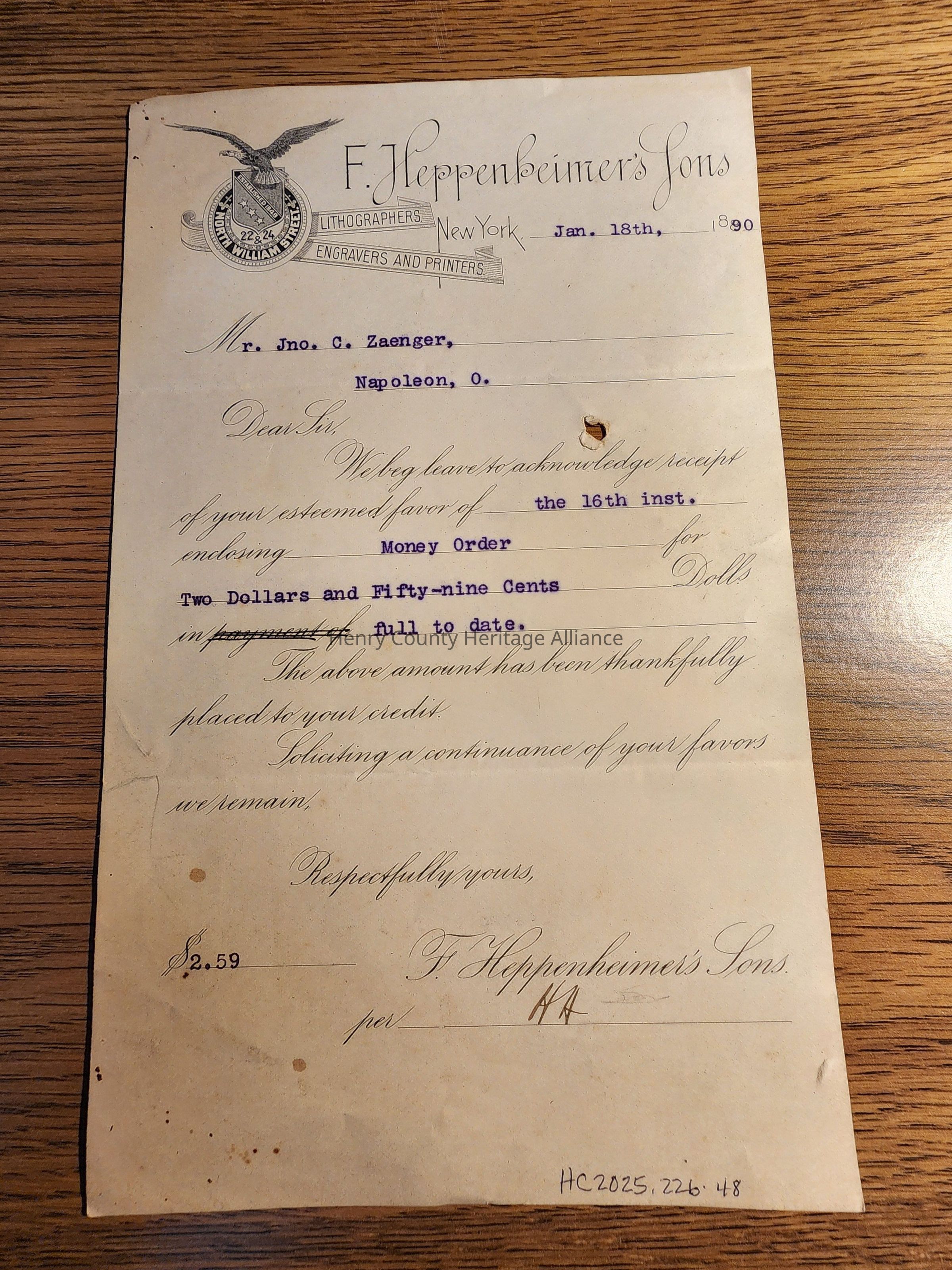 F. Heppenbeiner's Sons Receipt