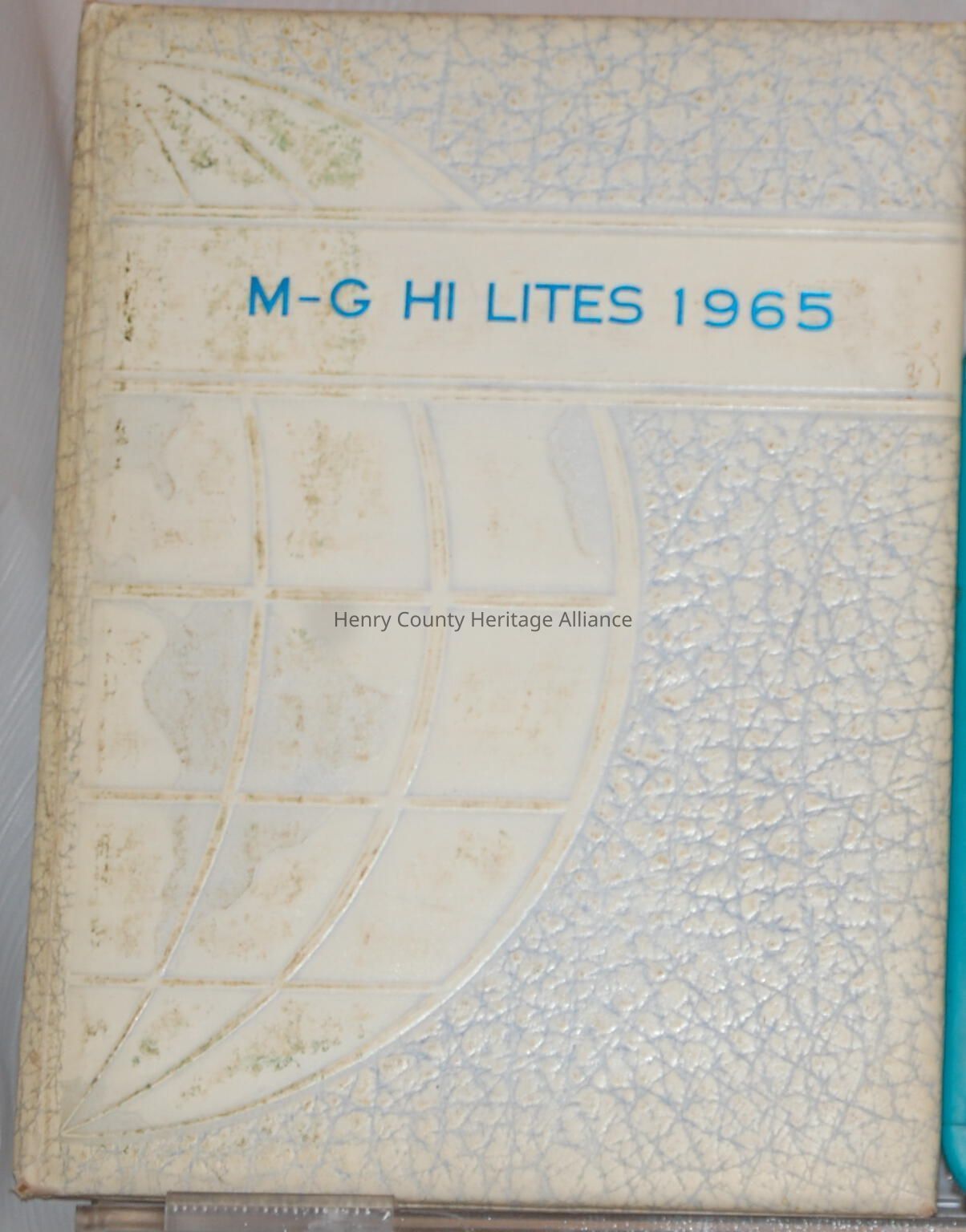white with aqua blue lettering on hardbound cover " M-G HI-LITES 1965"