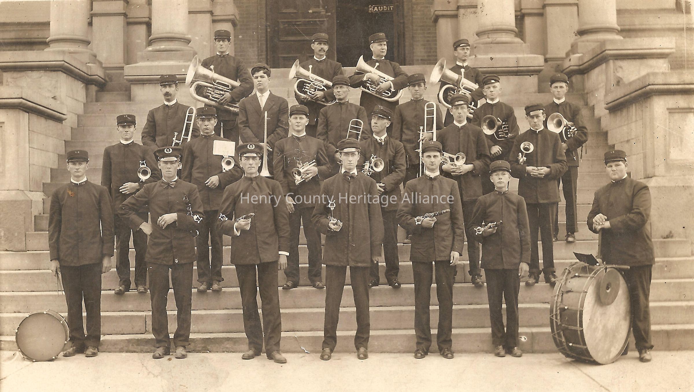 The image shows a vintage black and white photograph featuring a group of uniformed musicians, a marching band, arranged in rows on the steps of the Henry County Courthouse. They are mostly young men dressed in matching dark uniforms with caps, each holding a variety of brass and woodwind instruments such as tubas, trombones, trumpets, and clarinets. Two men at the front hold drums, emphasizing their roles as percussionists. The musicians’ serious expressions and formal attire suggest a professional or ceremonial gathering.