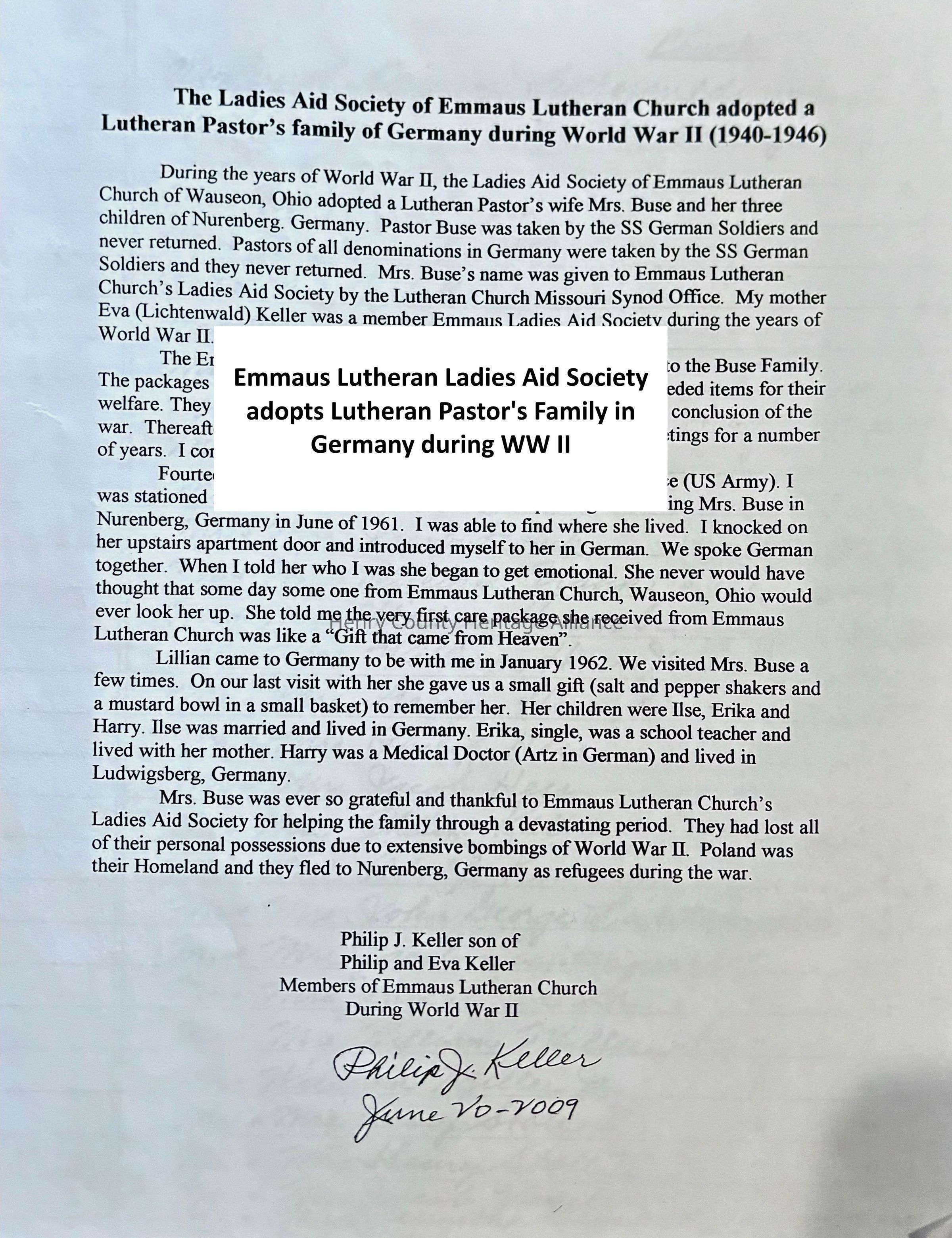 Wauseon, Fulton County, Ohio - Story of Ladies Aid adopting a Lutheran pastor's family in Germany after the pastor was taken by the SS German soldiers and a partial list of church members during World War II and their countries before immigration.