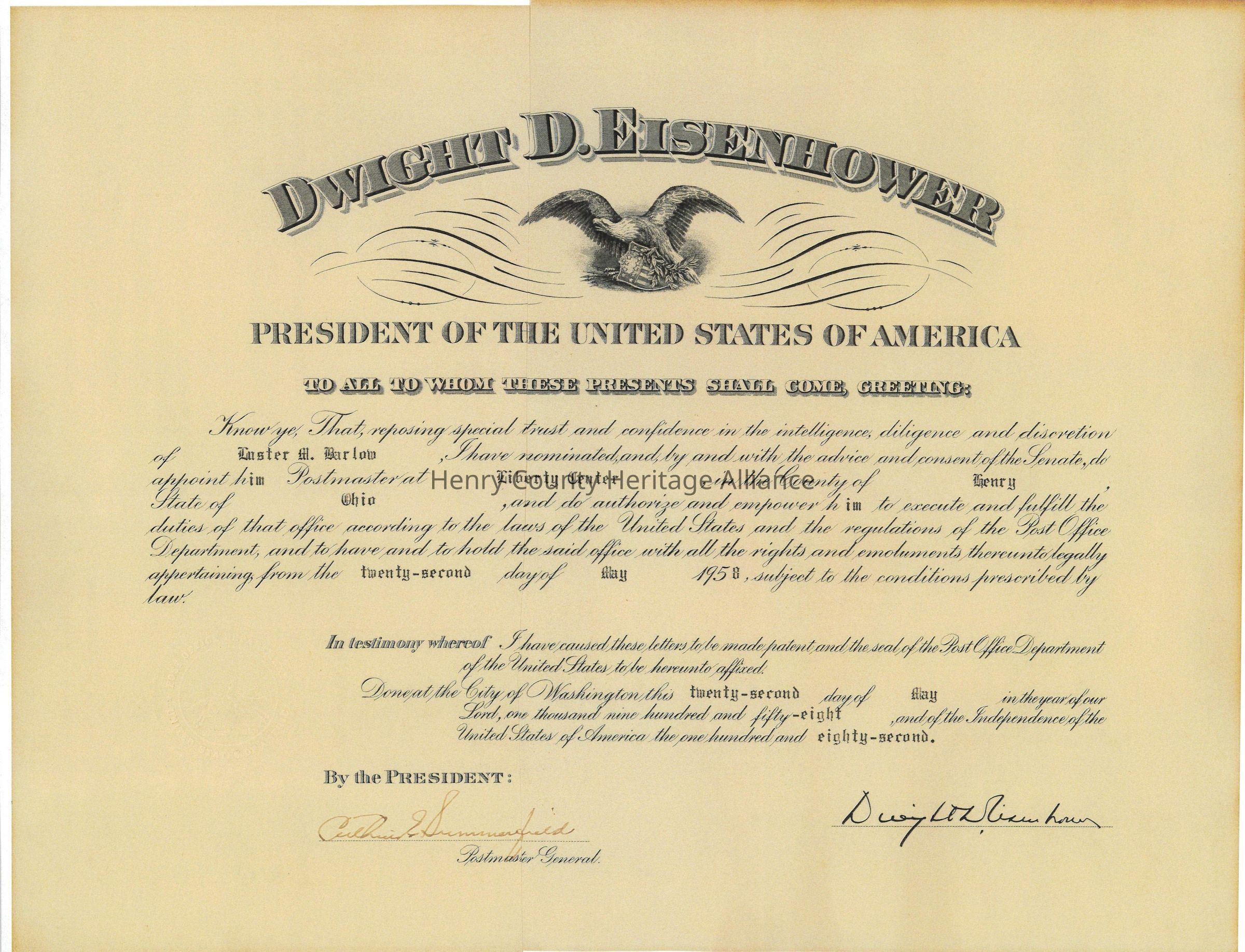 Certificate From President Dwight D. Eisenhower Appointing Luster Barlow Postmaster of Liberty Center, May 22, 1958Collection