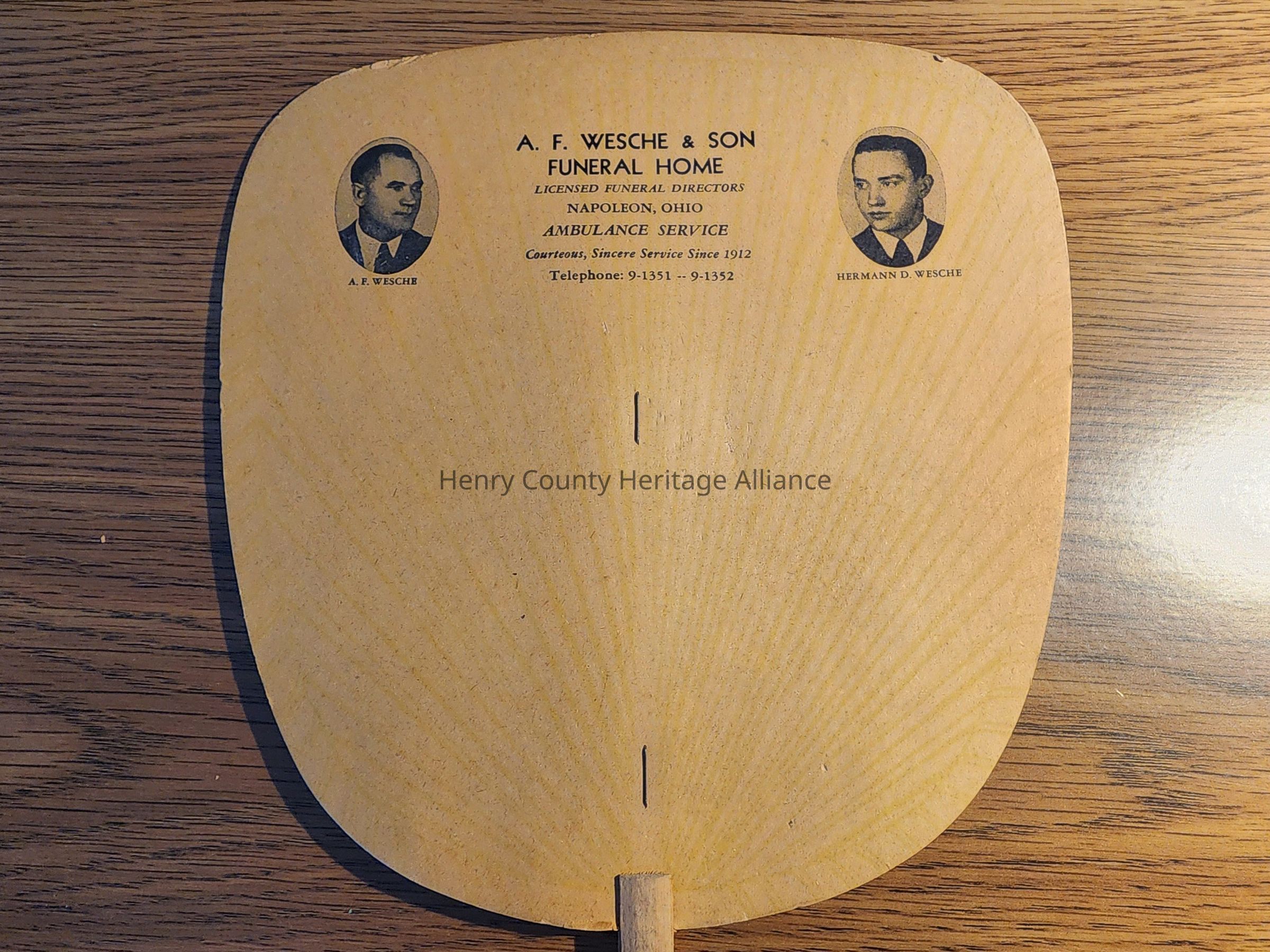 AF Wesche, Herman Wesche Funeral Home Hand Fan, Advertising