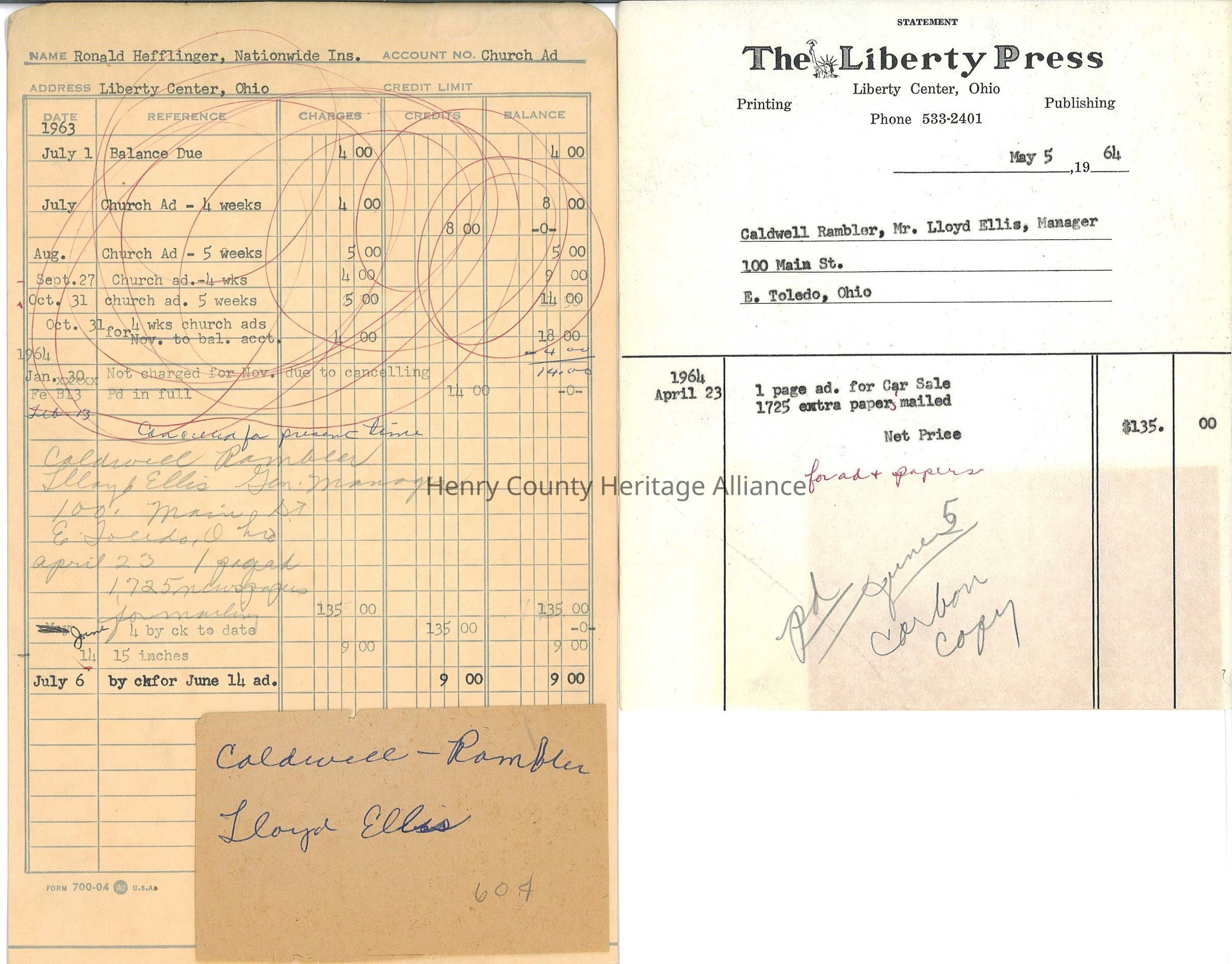 An Invoice for Ronald Hefflinger, Nationwide Ins. From The Liberty Press, May 5, 1964 for Church AdvertismentScope and Content