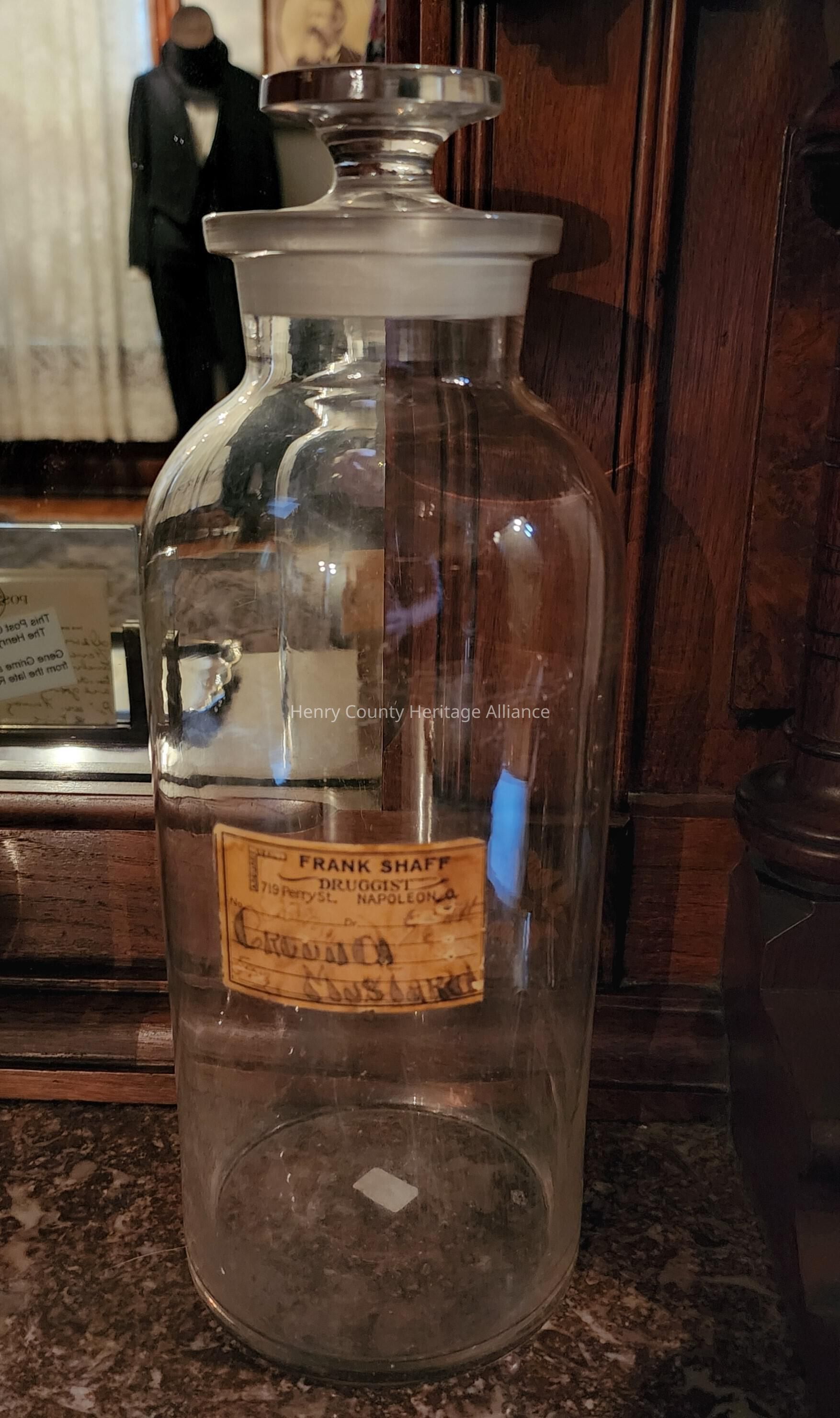 Frank Shaff Drugist, Clear Bottle w/Lid. 13/1/4" tall