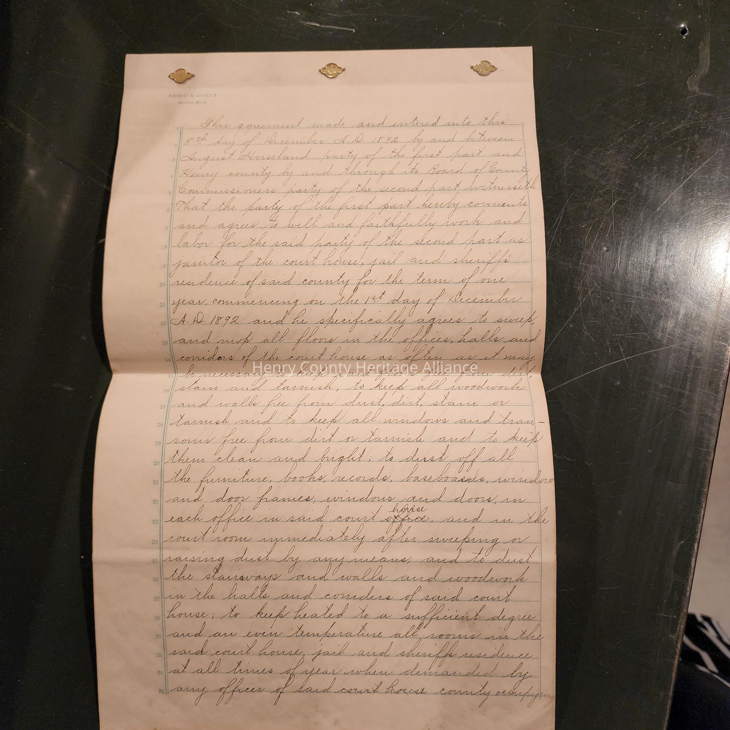 August Hirshland, Contract for Employment at the Henry County Courthouse & Jail