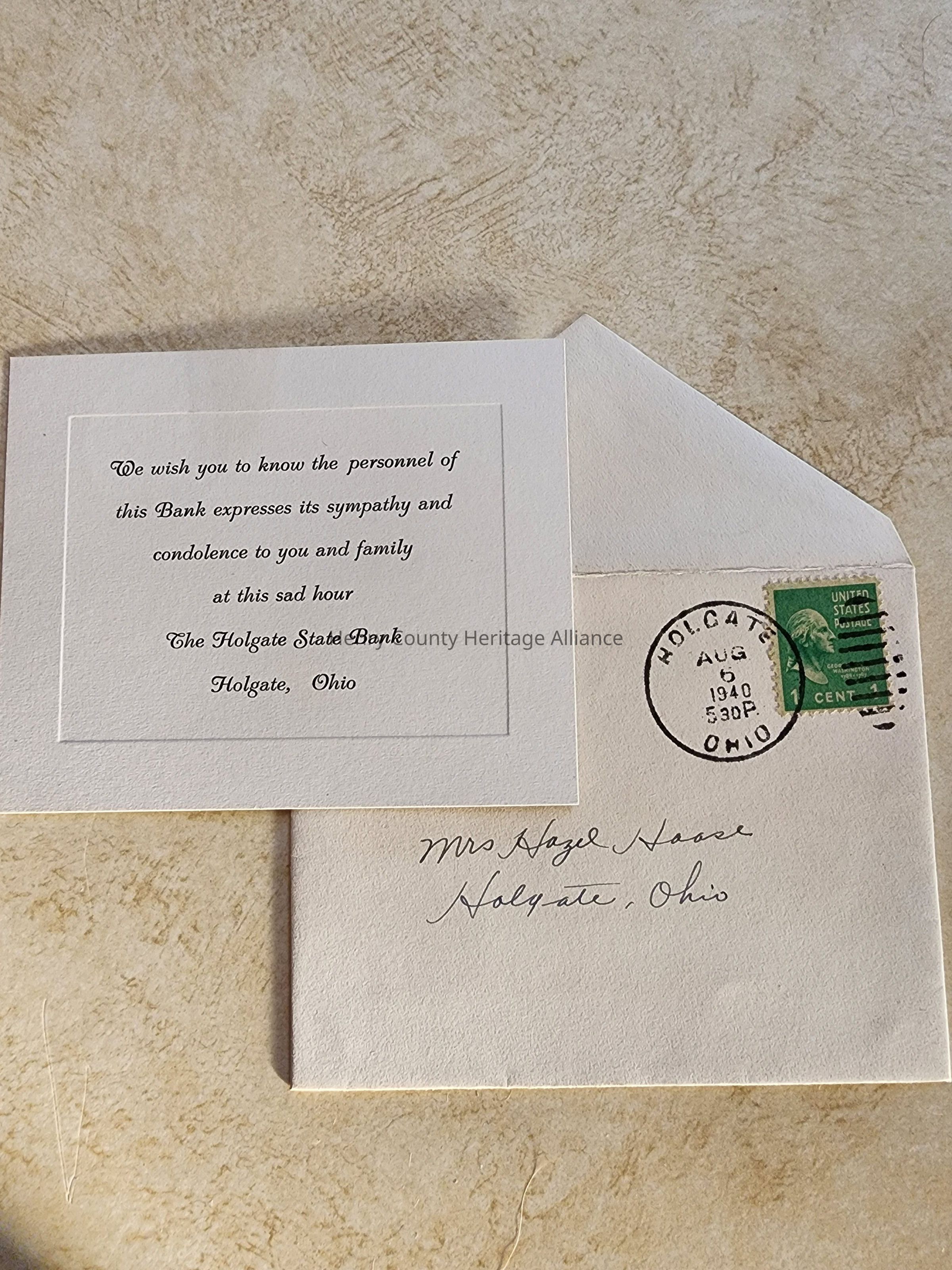 Condolence Card from the Holgate State Bank to Mrs. Hazel Mink Haase
