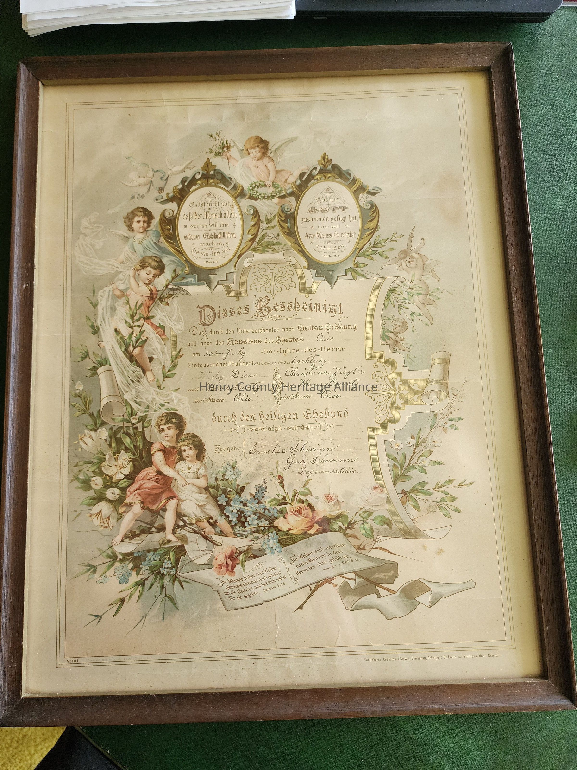 Wedding Certificate, German, 1889 Wesley Dirr & Christina Zeigler