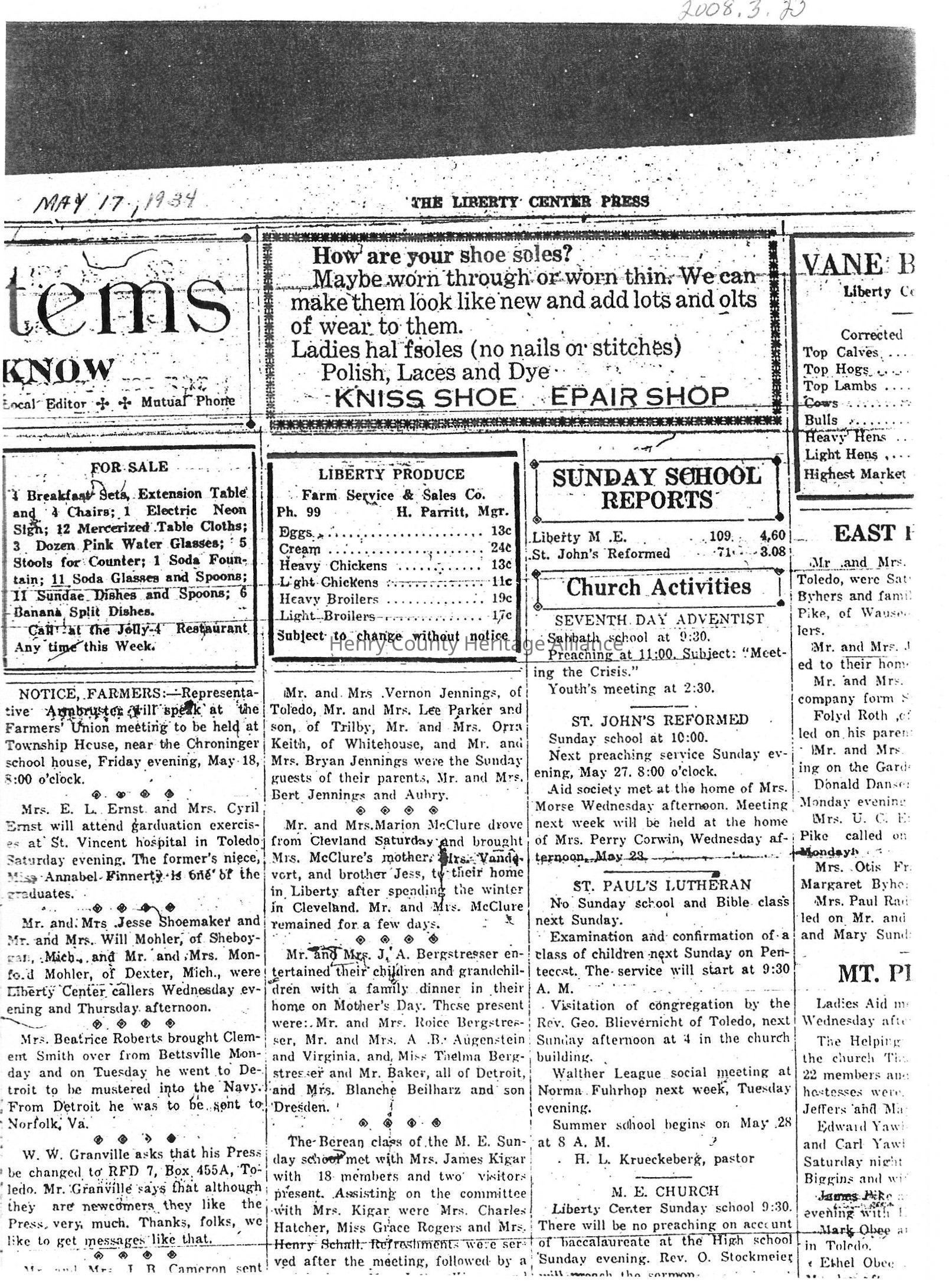 Kniss Shoe Repair Shop Ad in The Liberty Center Press - May 17, 1934