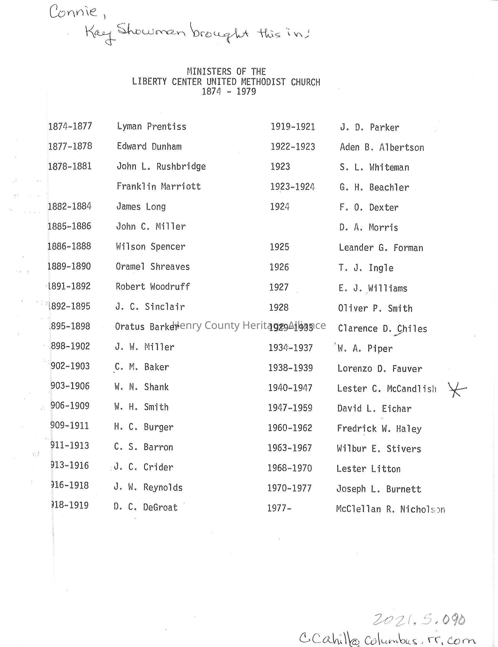 Roster of Liberty Center United Methodist Ministers from 1874-1979