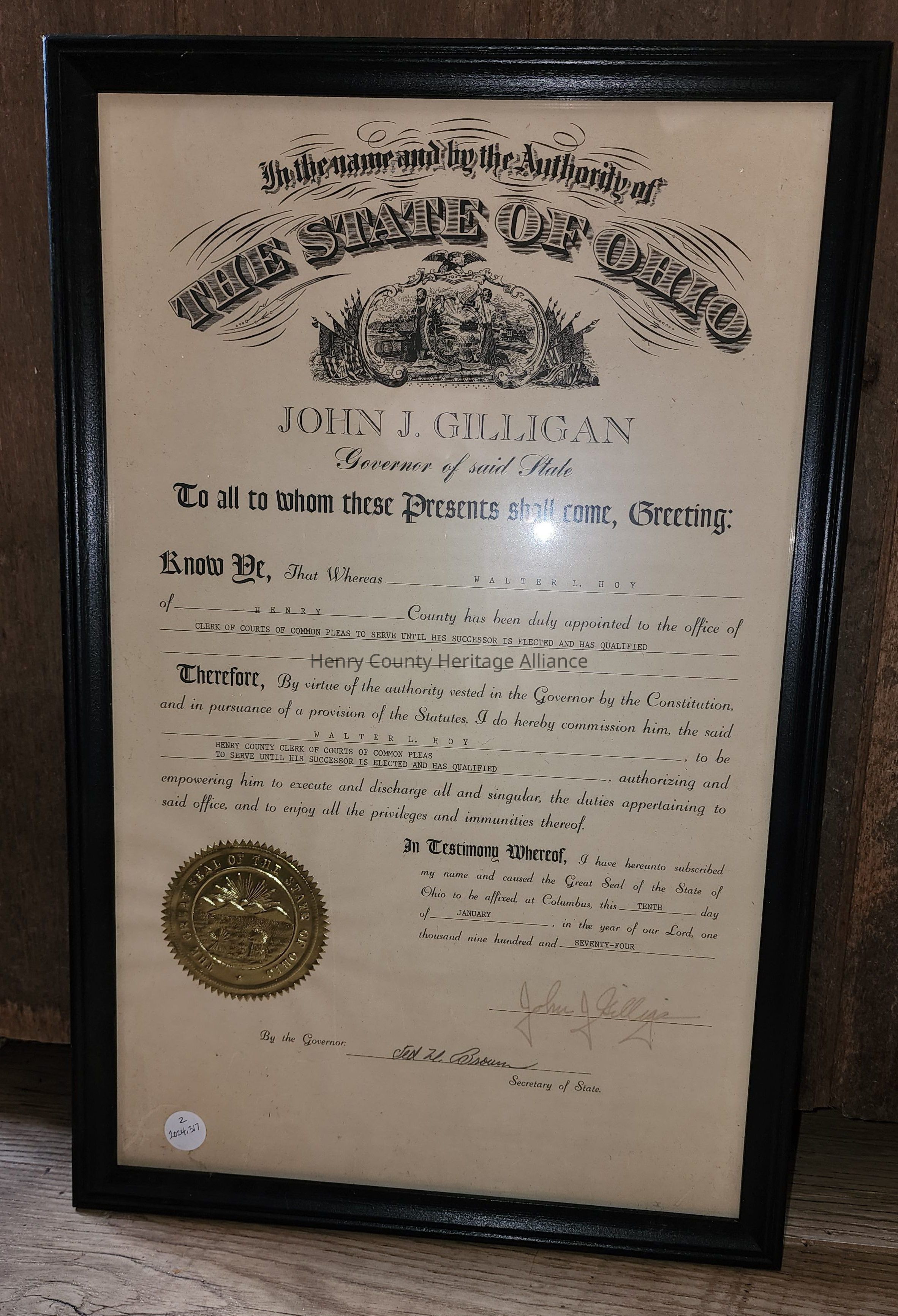 Framed Certificate given to Walter Hoy by John Gilligan, Governor of Ohio. Framed