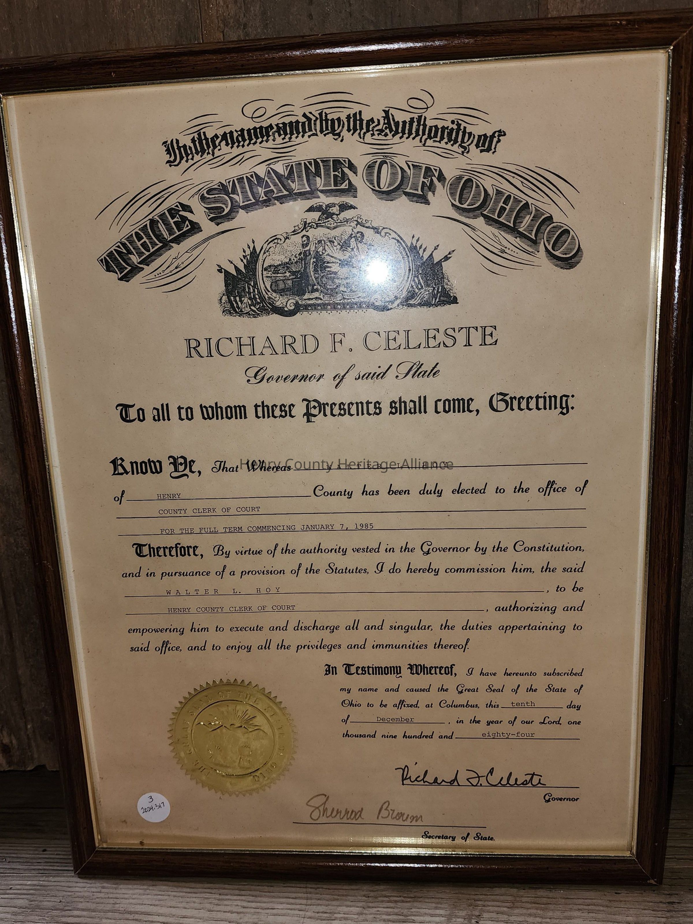 Call to Action, Henry County, Ohio Clerk of Courts Certificate from Governor Celeste to Walter Hoy, 1984