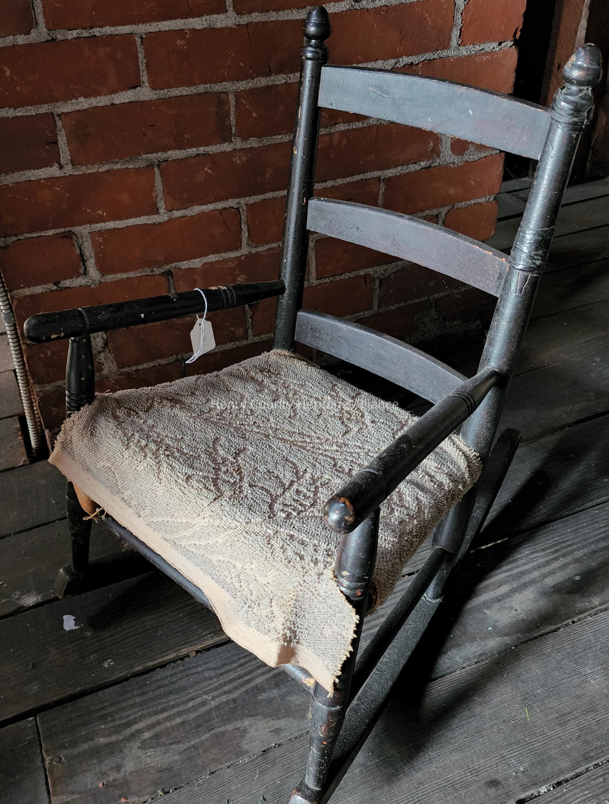 Belonged to Lawrence C Warden. Arms, Slat back, upholstered Seat (Married Merle Burden, bought farm on County Road 17, South of Florida, Ohio as an investment. Brtkers lived on farm 38 years. Merle gave chair to Linda nartker when she was born...Collection