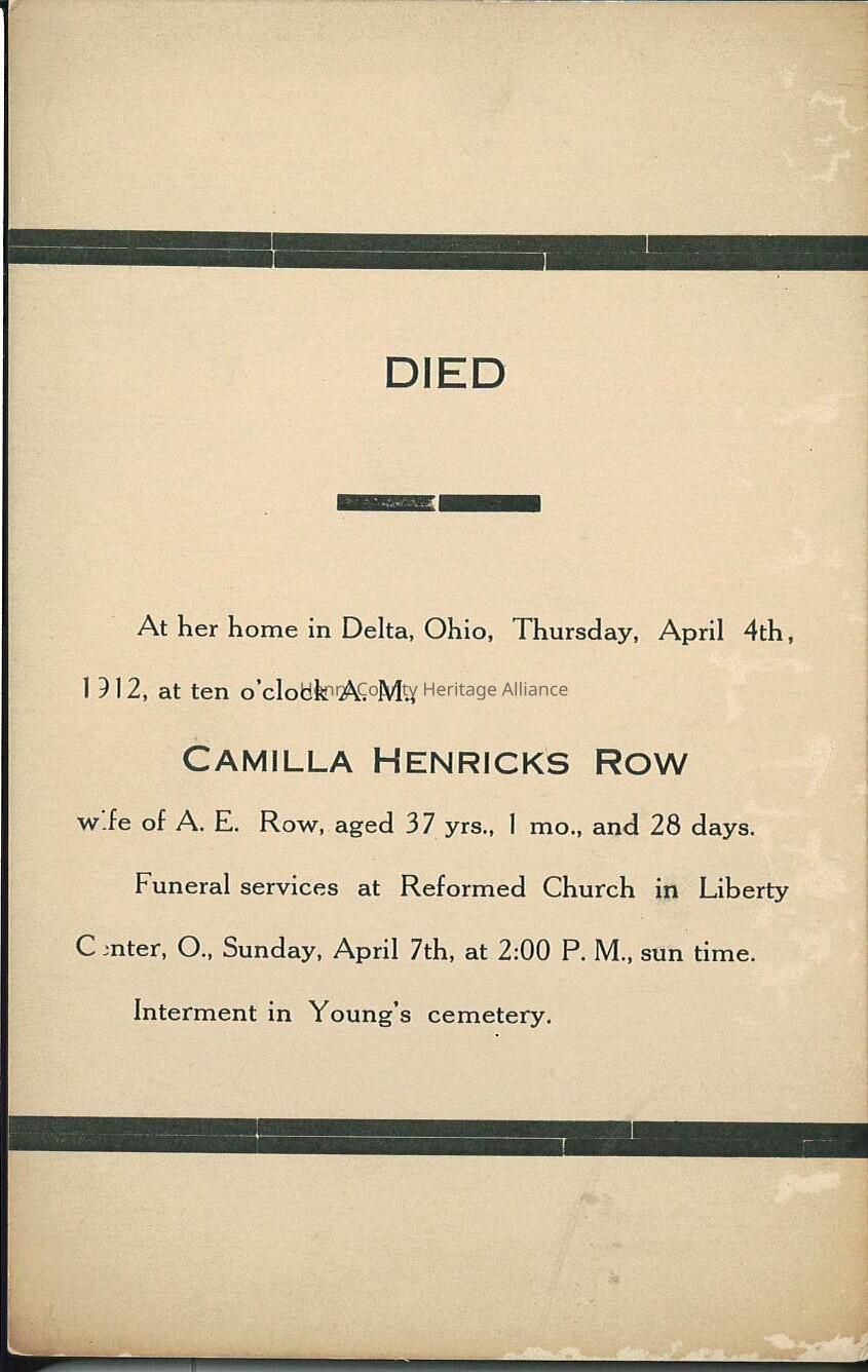 Death Notice of Camilla Henricks Row