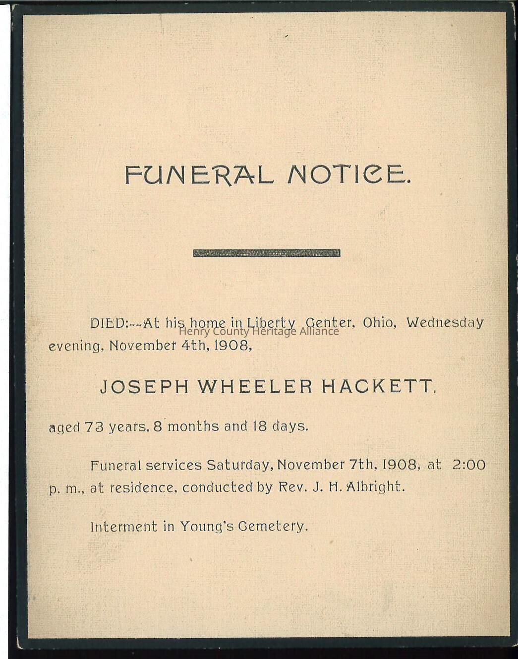 Death Notice of Joseph Wheeler Hackett