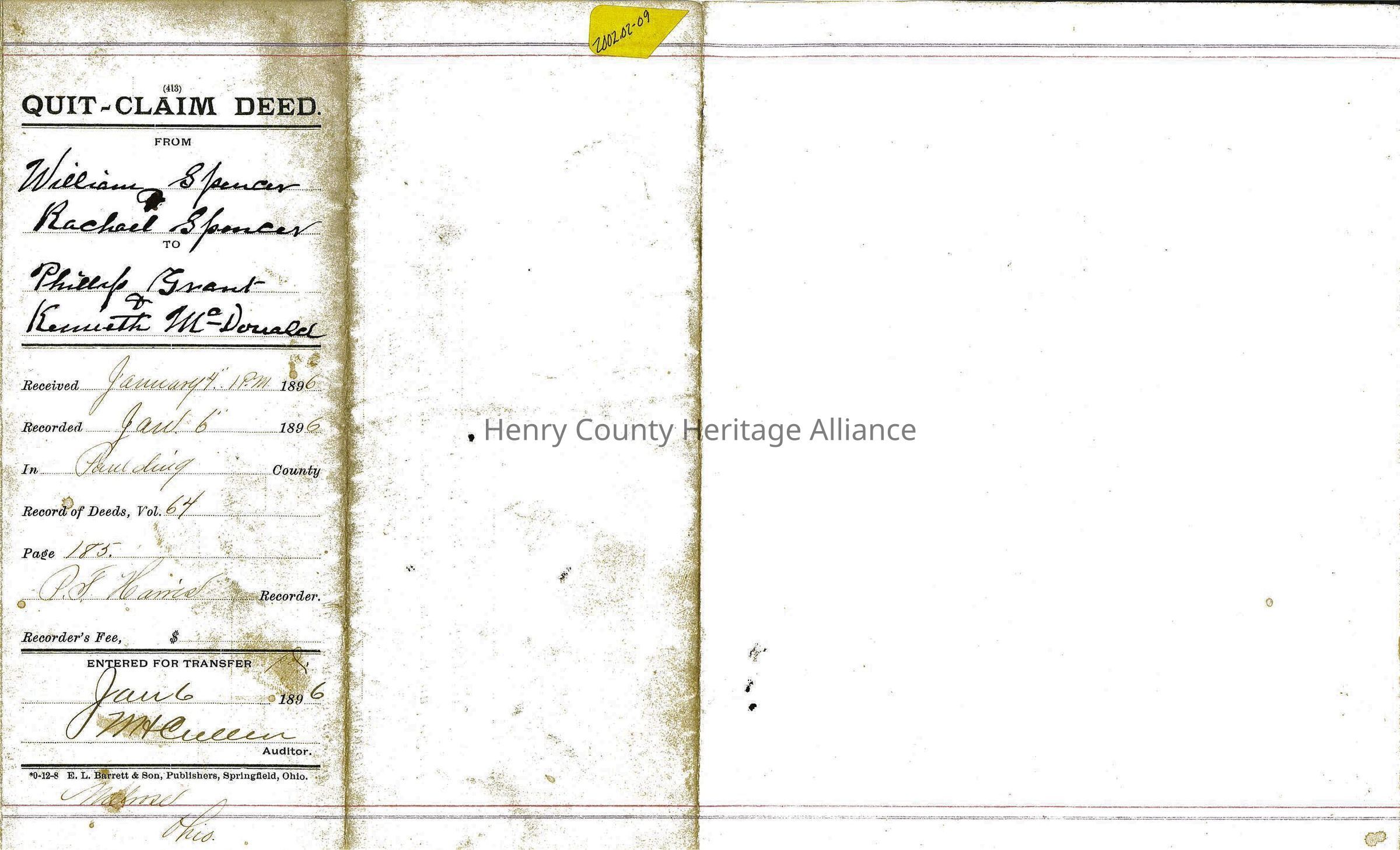 Deed of land from William Spencer to Phillip Grant and Kenneth McDonald