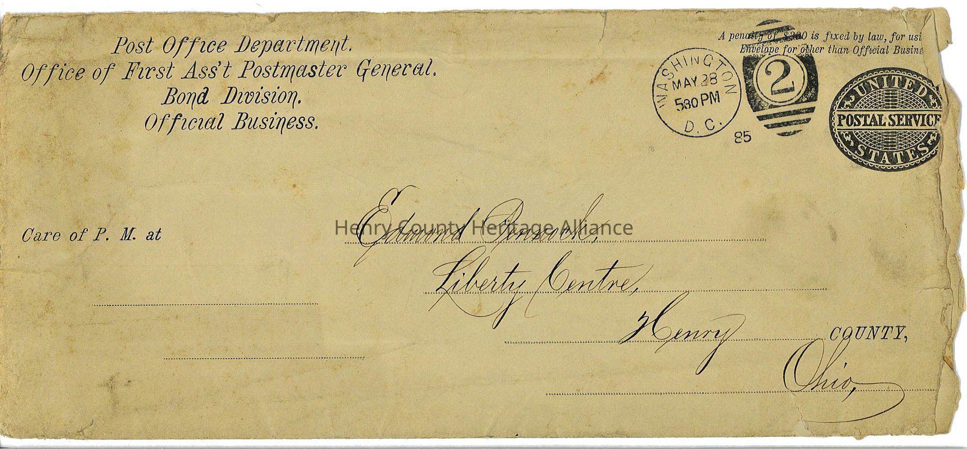 Envelope addressed to Edmond Penock from Post Office Department, dated May 28, no year on stamp.