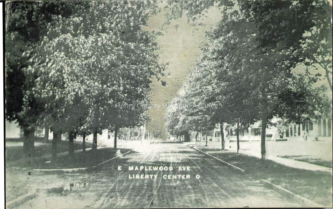 The black and white image depicts a tranquil scene of E. Maple Street in Liberty Center, Ohio (looking east), showcasing a shaded, tree-lined street with evenly spaced trees casting dappled shadows on the road. The trees form a natural canopy, highlighting an inviting pathway that appears straight and well-maintained. The street is bordered by sidewalks, which suggest a residential area, and visible in the background are evenly spaced houses that blend into the serene setting. The photograph captures a moment of stillness, with no visible movement of people or vehicles, providing a timeless quality to the scene. The words "E Maplewood Ave Liberty Center O" are inscribed near the bottom.