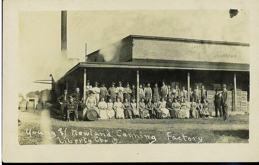 The photograph depicts a large group of men and women standing and sitting in front of a building with a sign that reads "Young & Newland Canning Factory, Liberty Center, Ohio." The building appears to be a factory with a visible smokestack suggesting industrial activity, likely related to canning. The men are dressed in work clothes, including hats and overalls, while the women wear long dresses or aprons, indicative of early 20th-century fashion. There are stacks of wooden crates near the building for transporting goods. One man with a long white beard sits on a barrel, and a few men stand on either side, with one holding a pipe. The photograph is in black and white, conveying a historical atmosphere, and it offers a glimpse into the industrial and communal aspects of small-town life in that era, capturing a moment of pride and unity among the factory workers as they pause from their labors to pose.