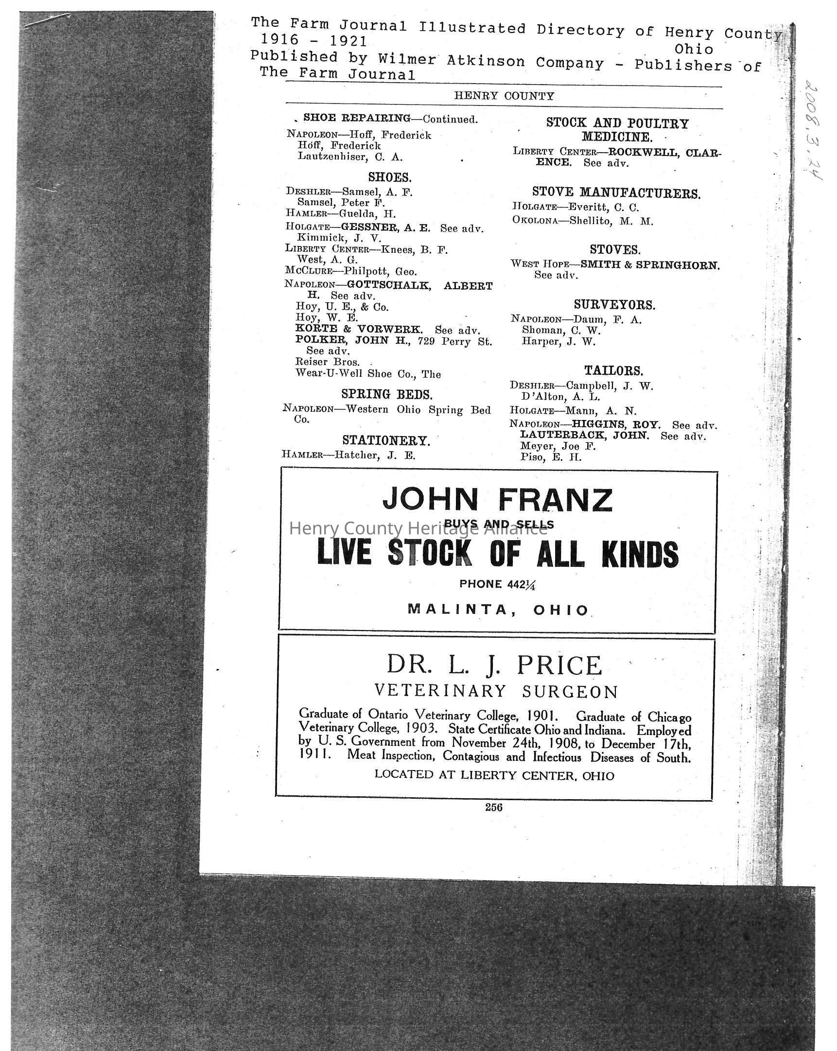 Farm Journal Illustrated Directory of Henry County 1916-1921 Listing Dr. L.J. Price, Veterinary Surgeon located in Liberty Center.Collection