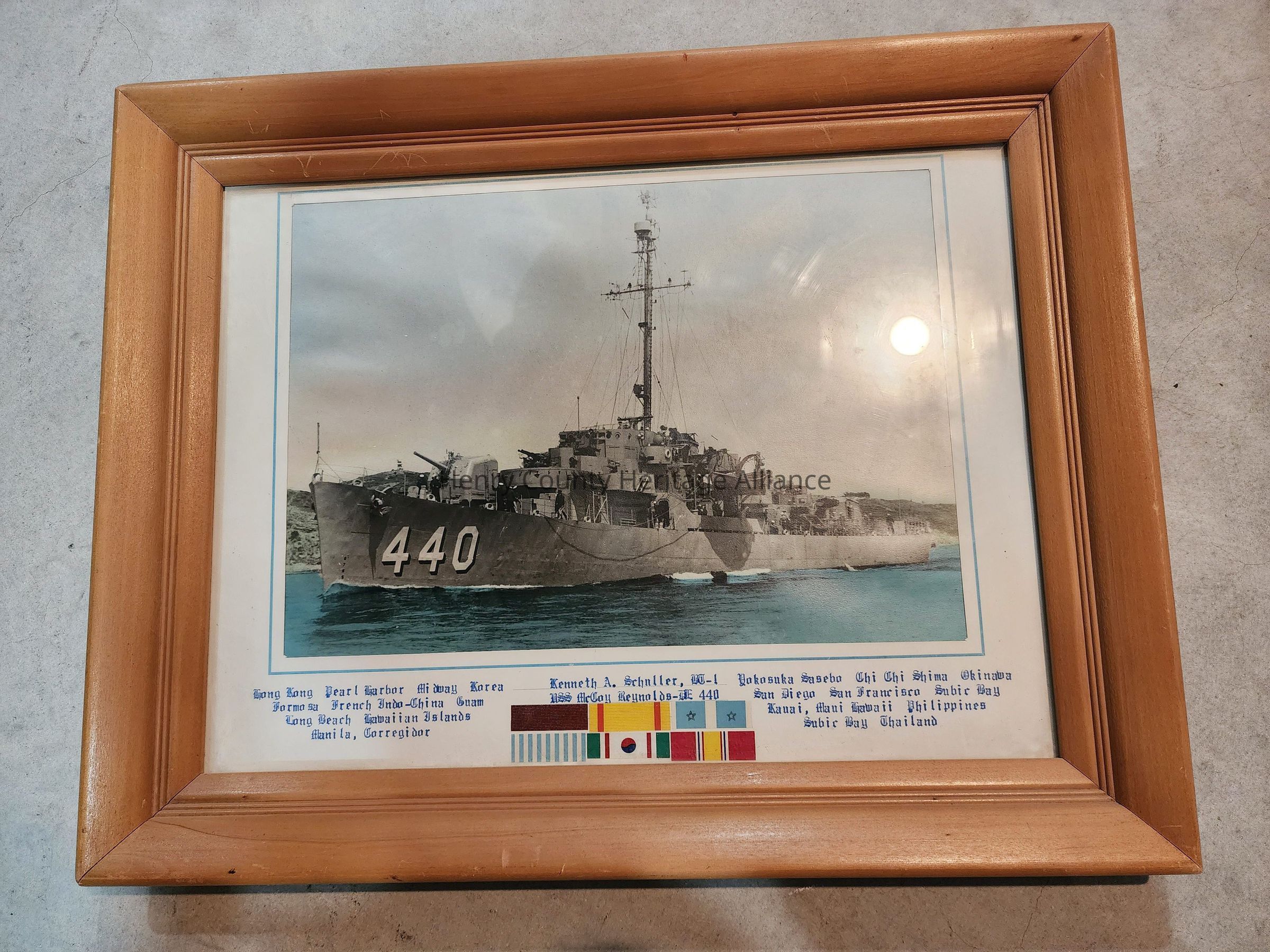 Naval Ship, Home to Kenneth Schuller during his Service in Korea. Paperwork describing the vessel is attached to the back of the Framed Photograph.Collection