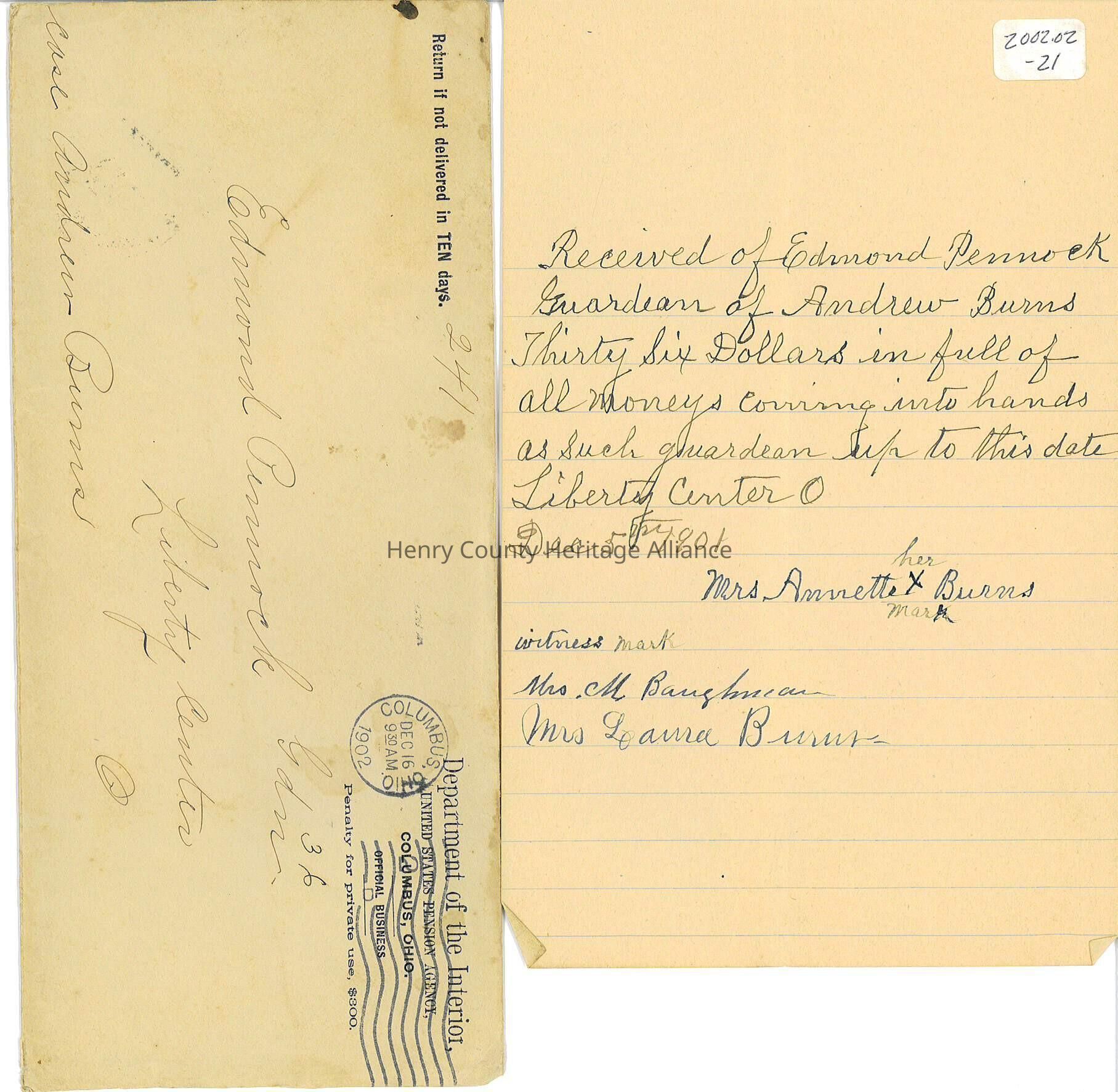 Handwritten Receipt of Edmond Pennock for the guardianship of Andrew Burns (an invalid) from his grandmother (Edmond's sister) Annette Burns