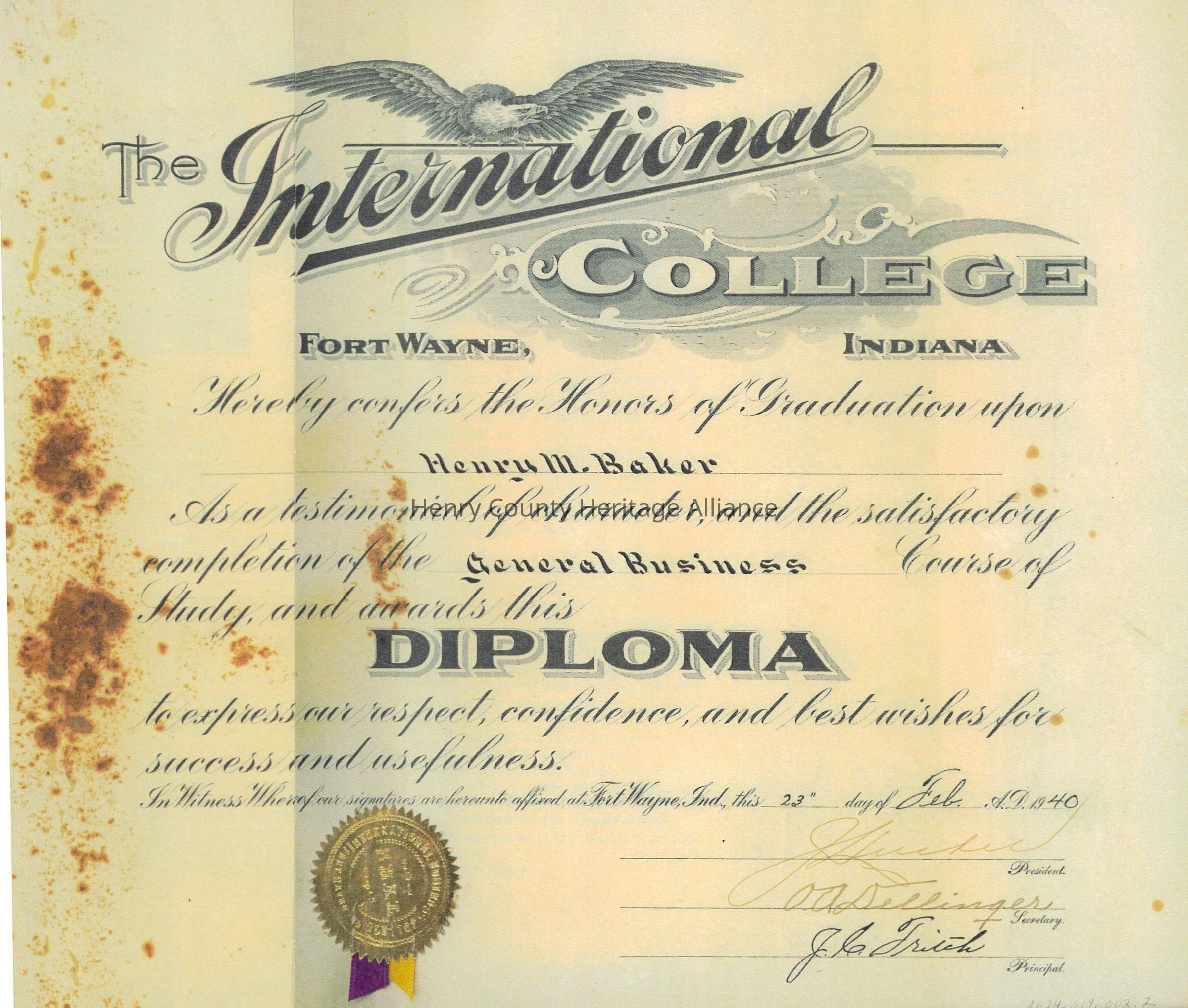 Henry Baker's Diploma from International College, Ft. Wayne, Indiana, February 23, 1940Scope and Content