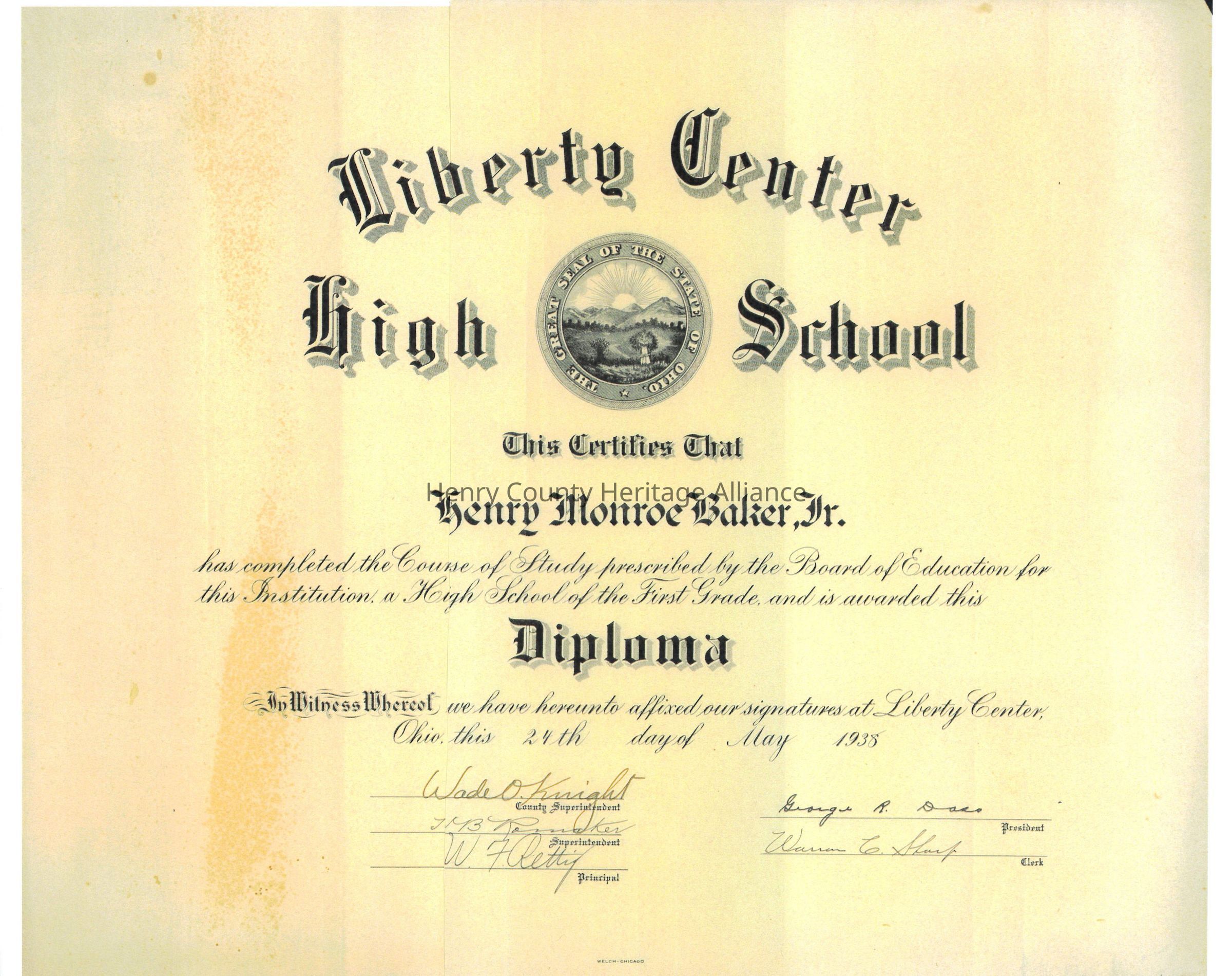 Henry Baker's High School Diploma from Liberty Center School -1938